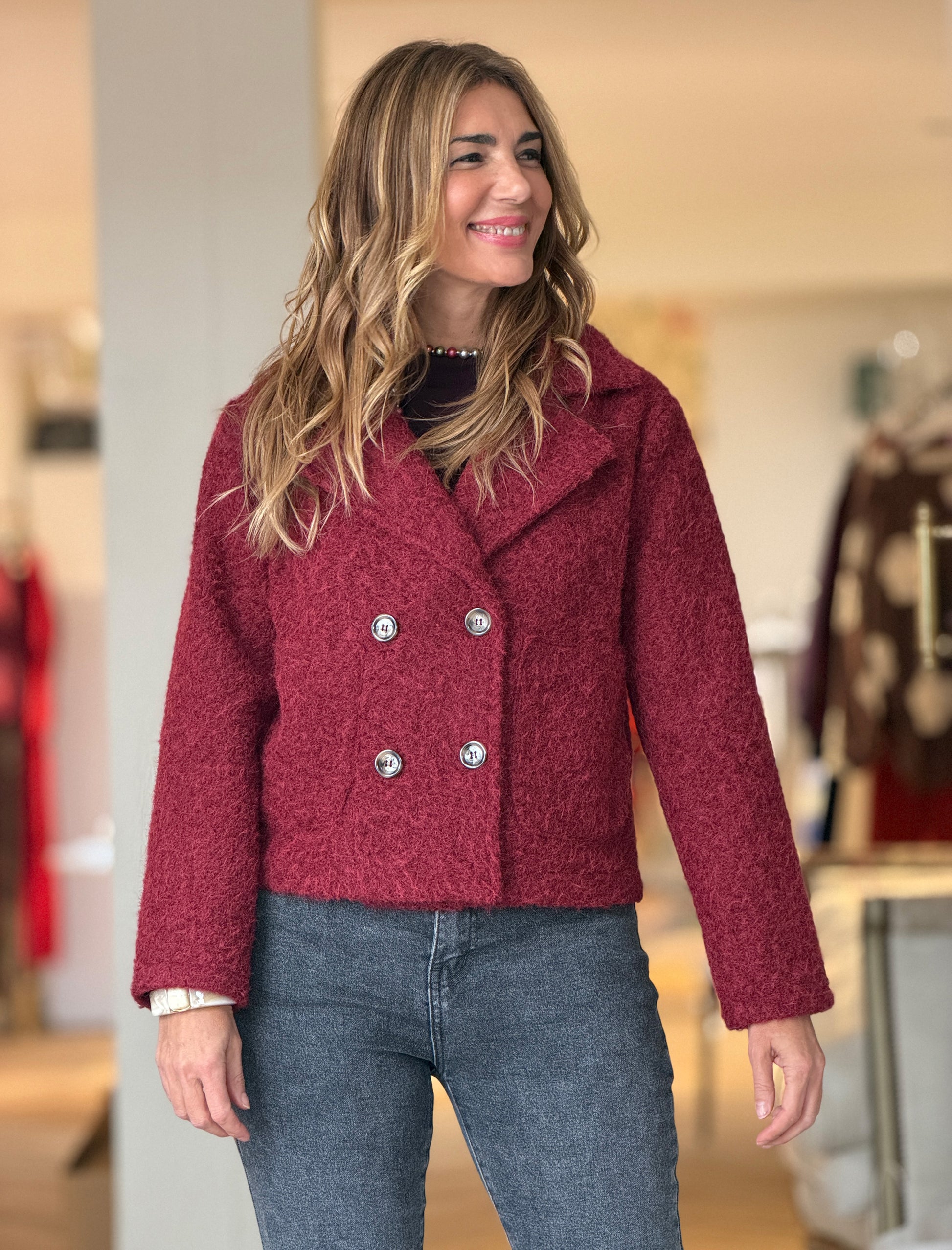 Chaqueta cruzada botones chic burdeos