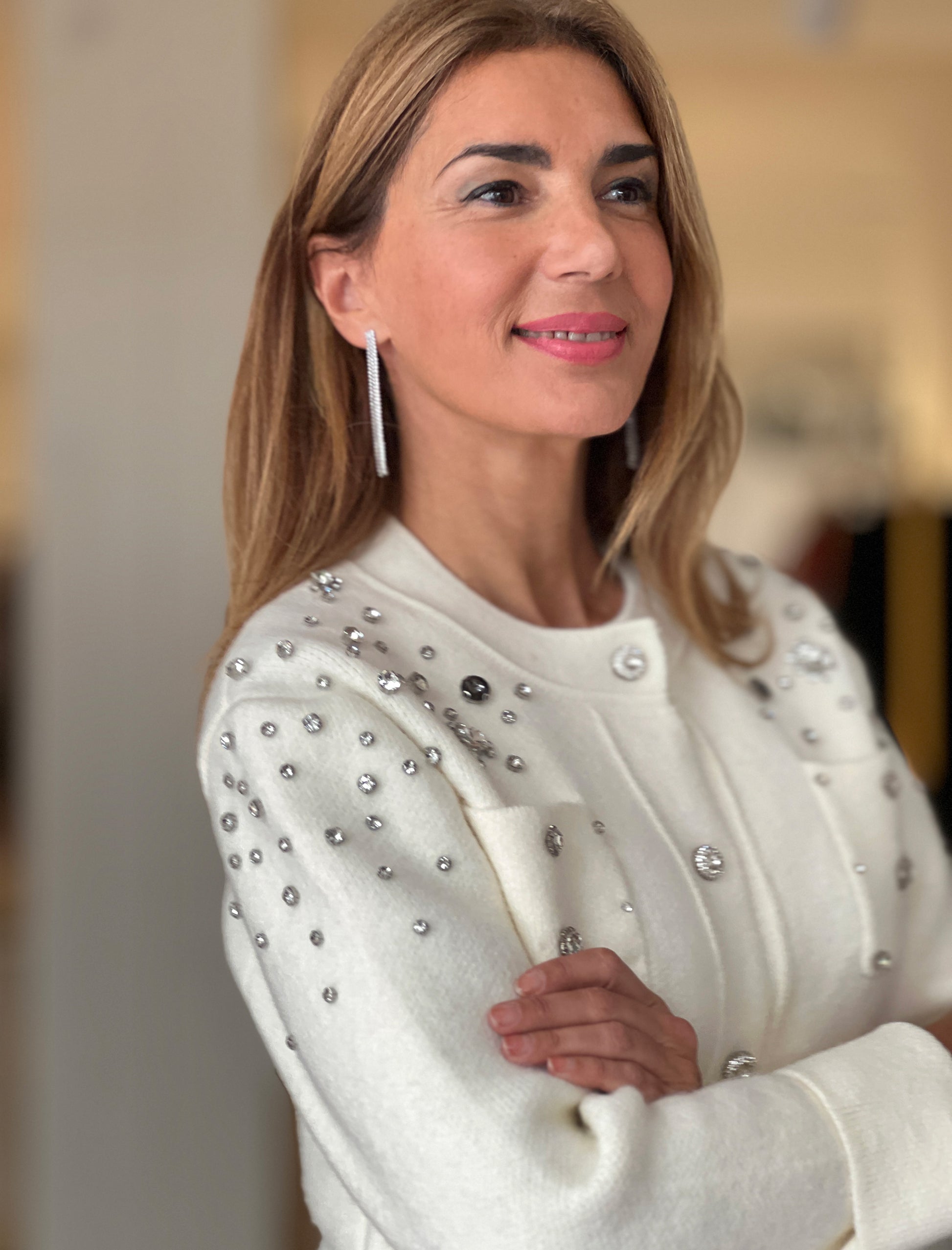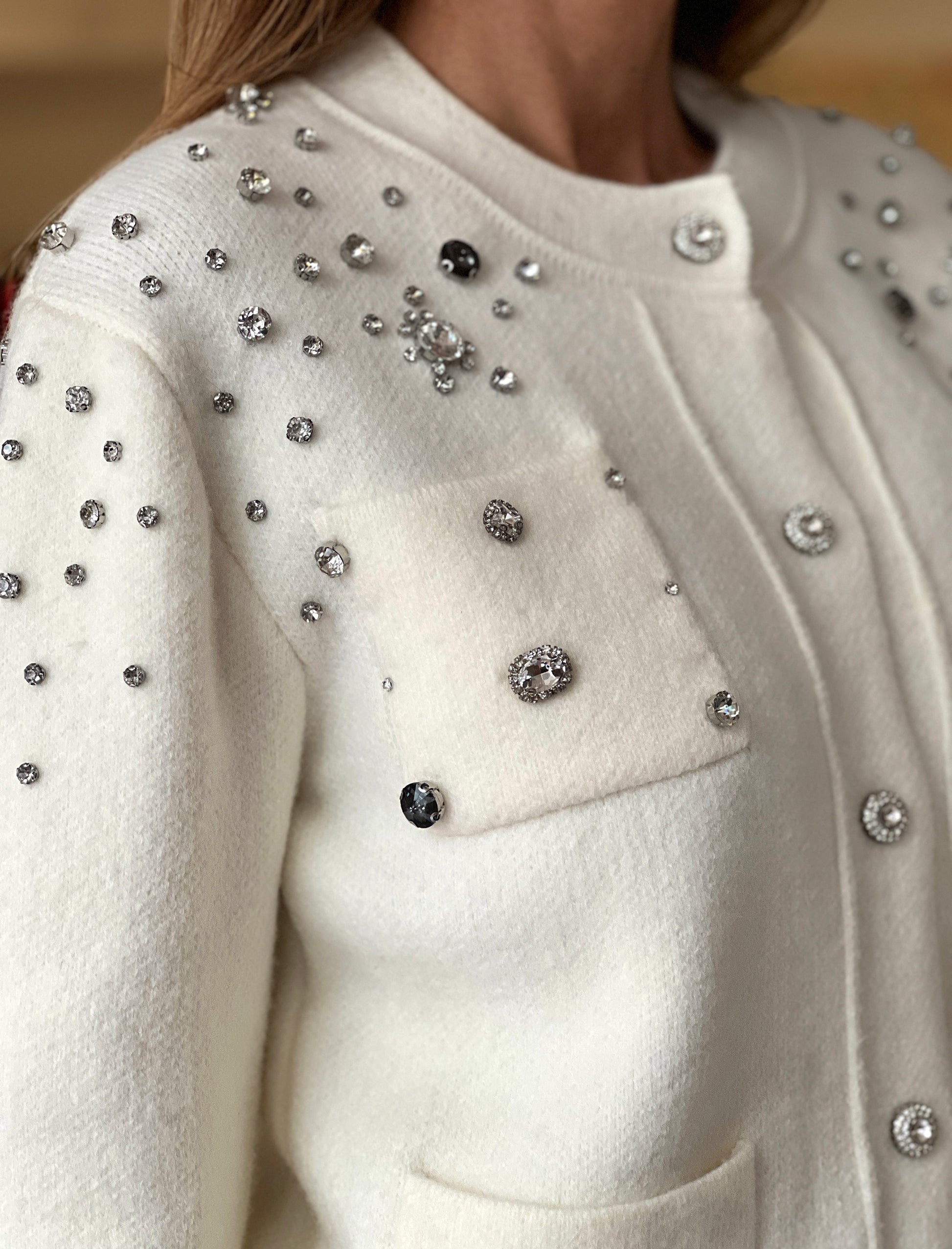 Chaqueta de circonitas presenta un diseño de punto decorado con circonitas en la parte superior y con una botonadura frontal de apliques brillantes. Consta de cuatro bolsillos, lo que la hace cómoda y favorecedora. Es una pieza versátil que funciona de día y de noche, con faldas, pantalones rectos o incluso sobre vestidos. Perfecta para cuando quieres un toque especial sin renunciar a la comodidad del punto.