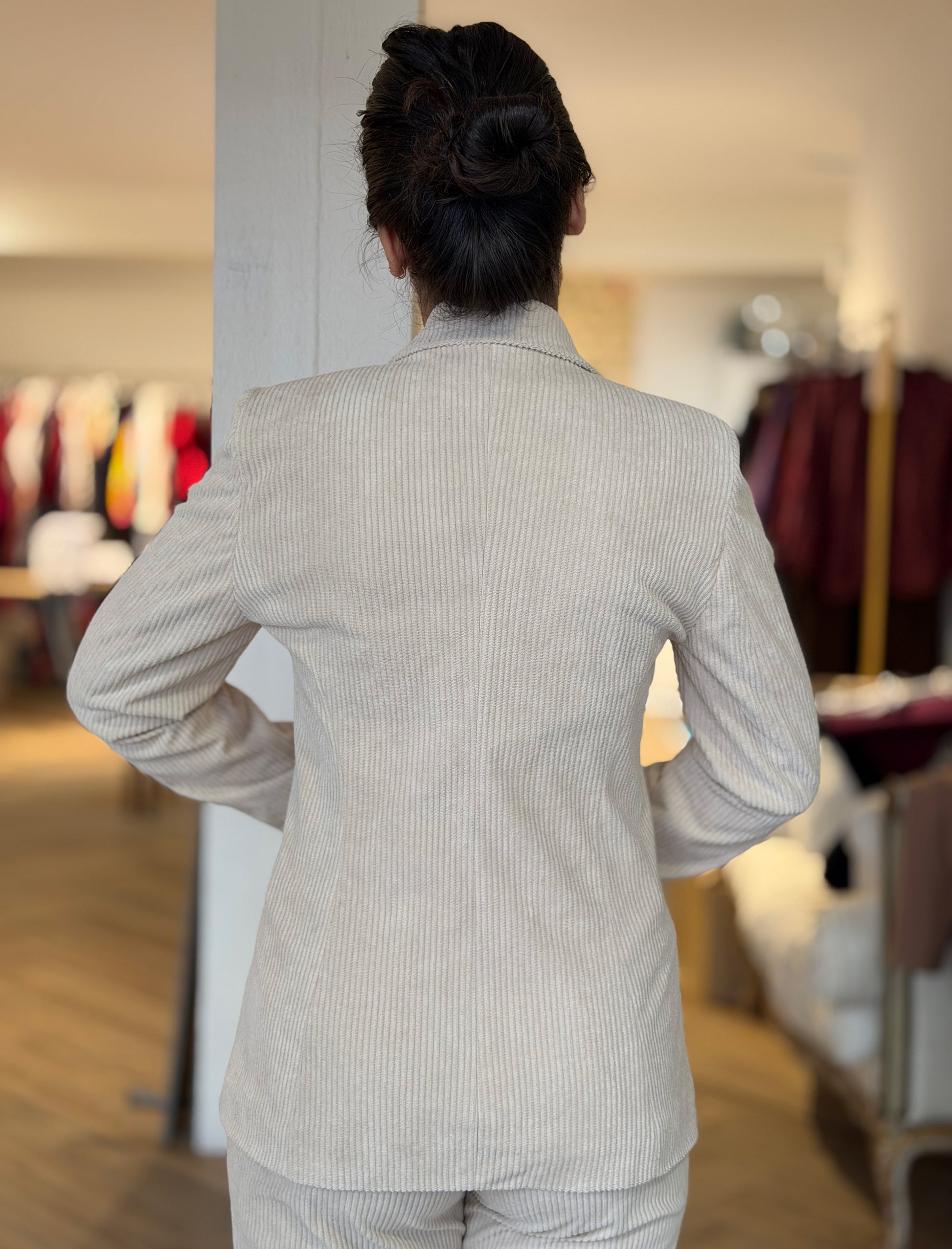 La Chaqueta Blazer de Pana Beig es una prenda ideal para elevar tu look. De color beige y está tejido en pana que le da un toque actual y estiloso. Su corte recto ligeramente entallado favorece muchísimo la figura y permite combinarla tanto con su pantalón a juego para un total look impecable, como con vaqueros, camisas fluidas o punto básico para un estilo más casual chic. Posee bolsillos laterales y botonadura.