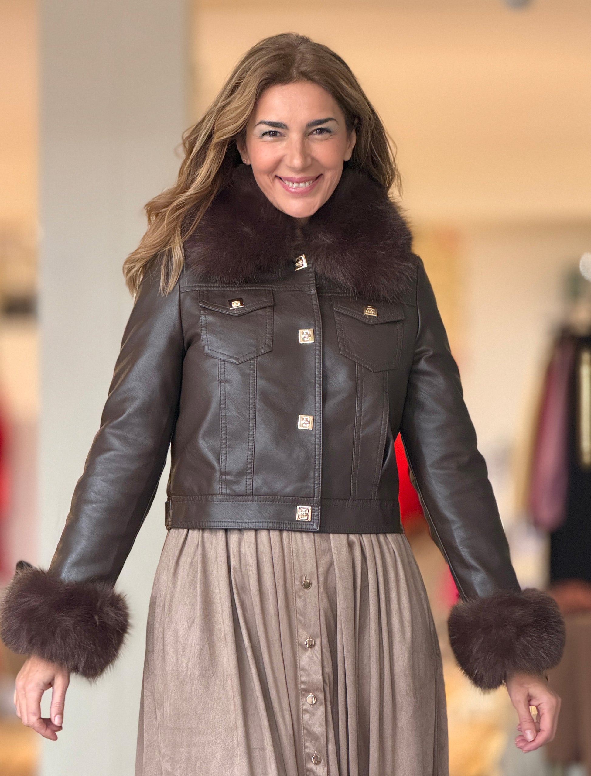 Chaqueta Marrón Chocolate de pelo desmontable corta con detalles de pelo en cuello, puños y bajo. El contraste del tejido exterior con el acabado voluminoso del pelo crea una prenda cálida y muy favorecedora. Su corte entallado realza la silueta y permite combinarla tanto con pantalones como con vestidos o faldas. Cierre frontal con botones, bolsillos laterales y forro interior.