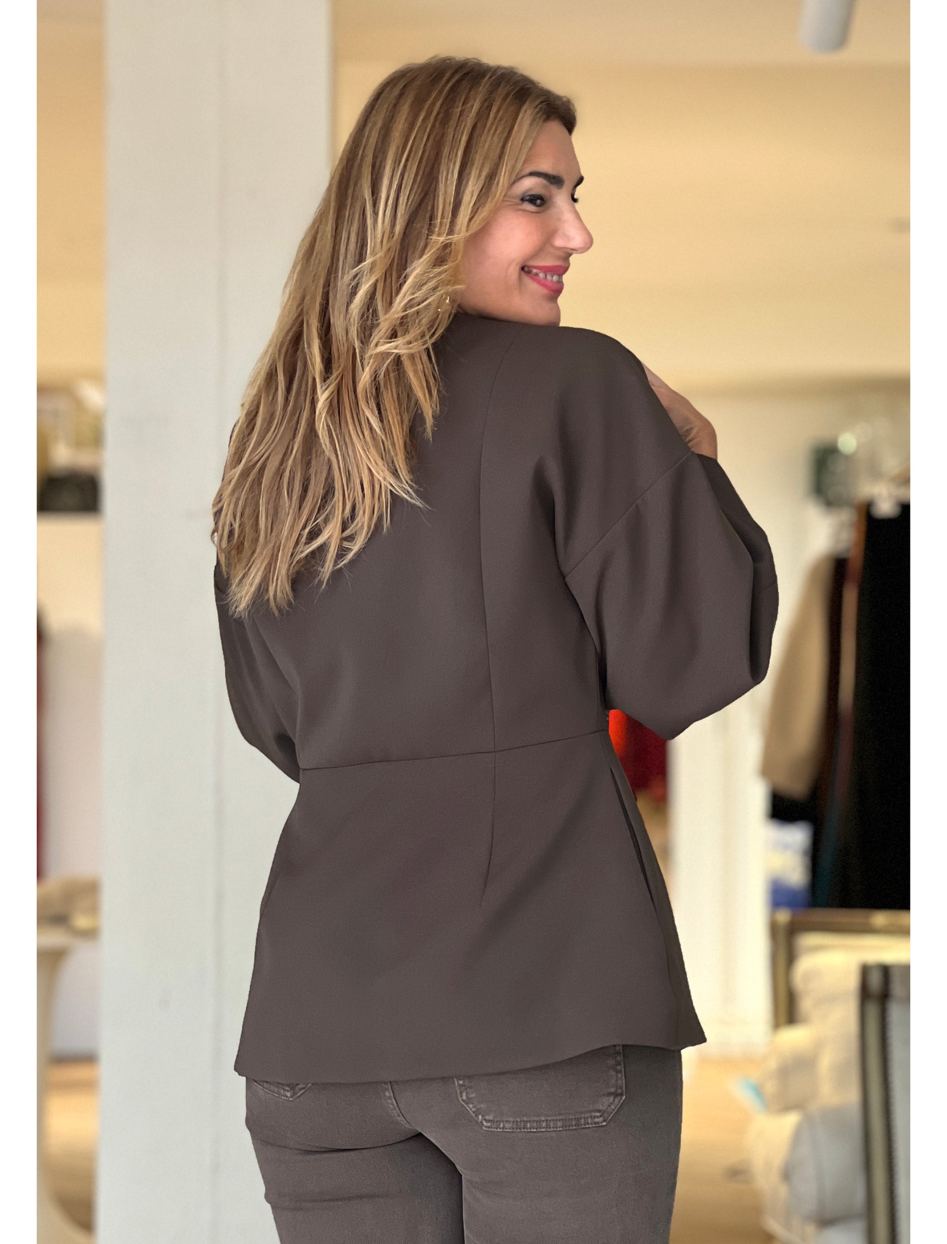 La chaqueta superchic Giorgio marrón es una prenda diseñada para estilizar la figura y elevar cualquier look. Confeccionada en un diseño con estructura que mantiene la forma y dibuja una silueta muy favorecedora. Su escote en V, unido al cruce delantero con dos botones forrados, estiliza y aporta un toque muy elegante. La manga es amplia y con volumen, que equilibra la figura y aporta modernidad. El bajo de la chaqueta cae recto y ligeramente entallado en la cintura..