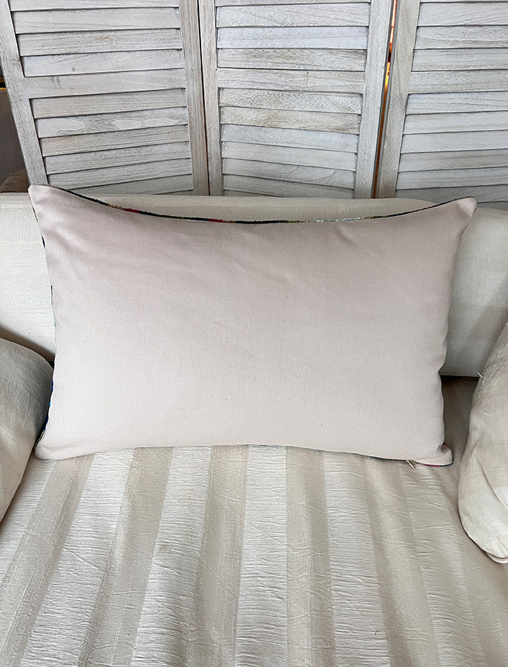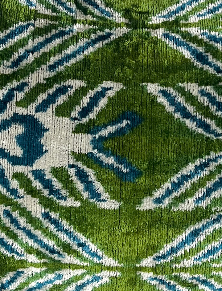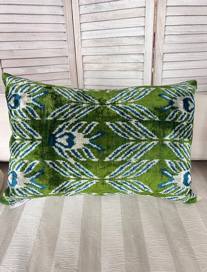 Cojín artesanal con tela de terciopelo Ikat, el frontal es de terciopelo y la espalda de algodón beige, lleva cremallera.
