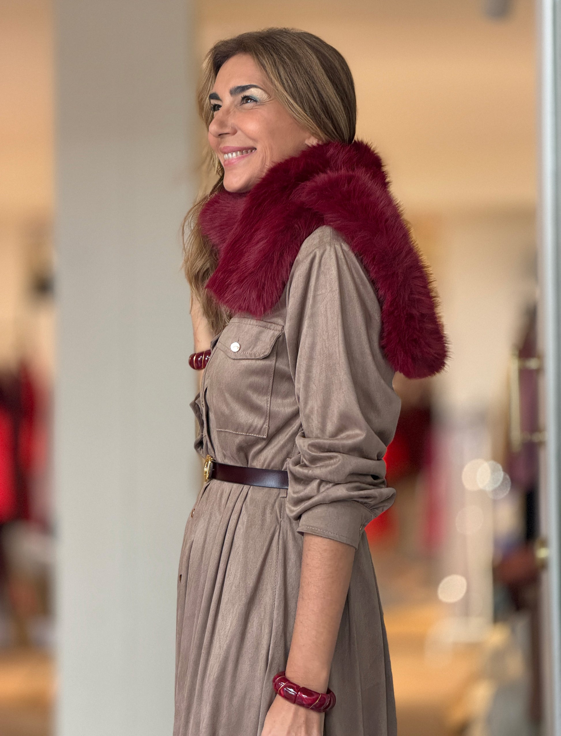 El cuello de pelo suave burdeos es es accesorio con textura suave y ligera que aporta calidez, y el tono blanco ilumina el rostro y combina con todas las gamas neutras y de color. Es perfecto para llevar con chaquetas o abrigos rectos. Un complemento ideal para sumar estilo y sensación de lujo.