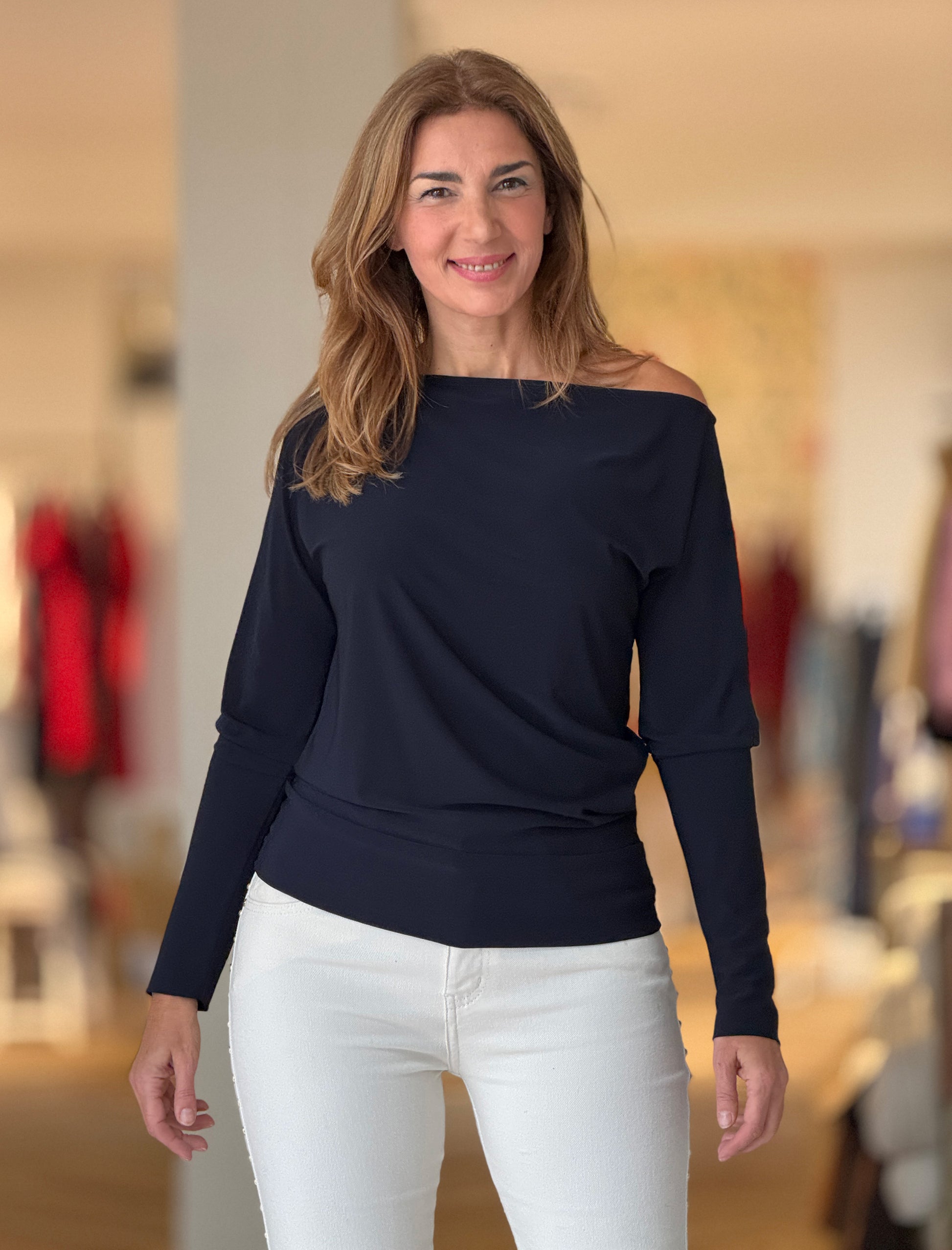 Cuerpo Ideal Soft marino de la colección "Made in Nuria" con un tejido suave con caída, este cuerpo es una prenda comodín para tu armario. Su escote asimétrico estiliza y alarga visualmente el cuello, y su tono neutro combina con todo.