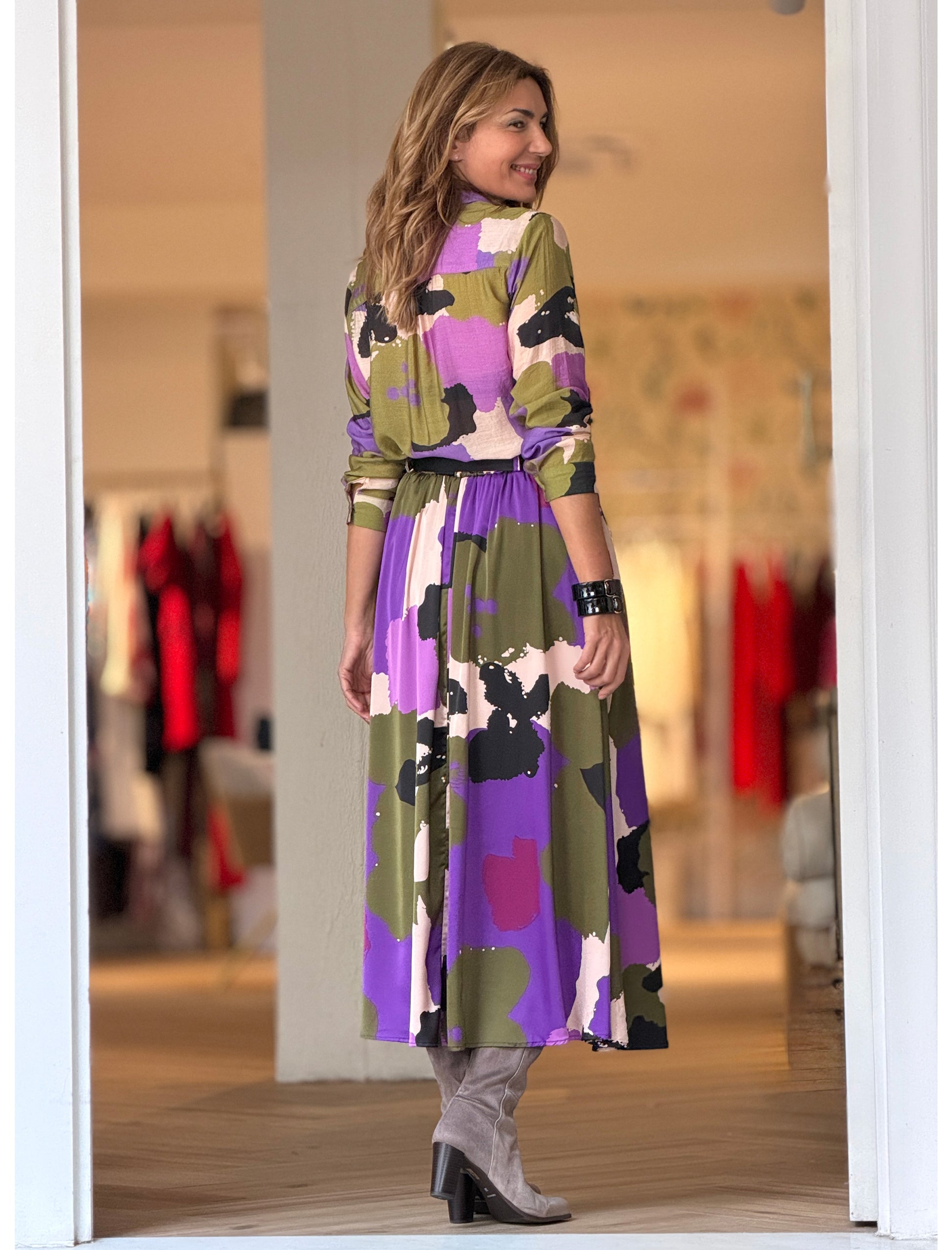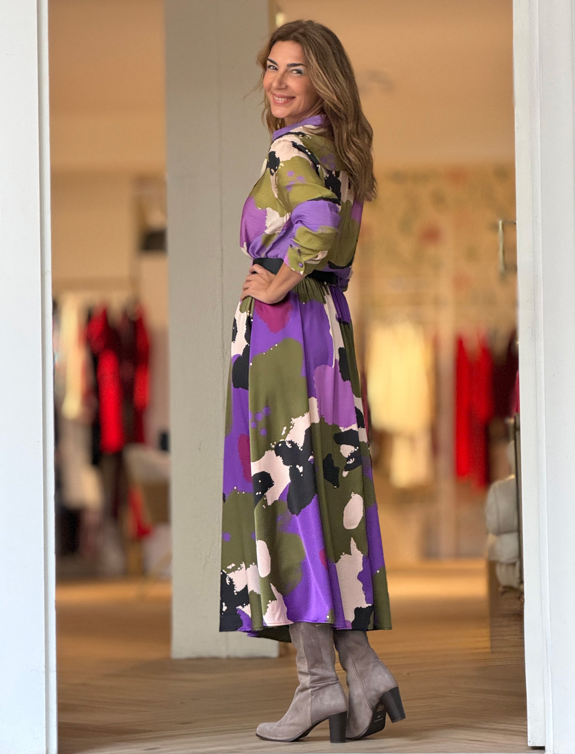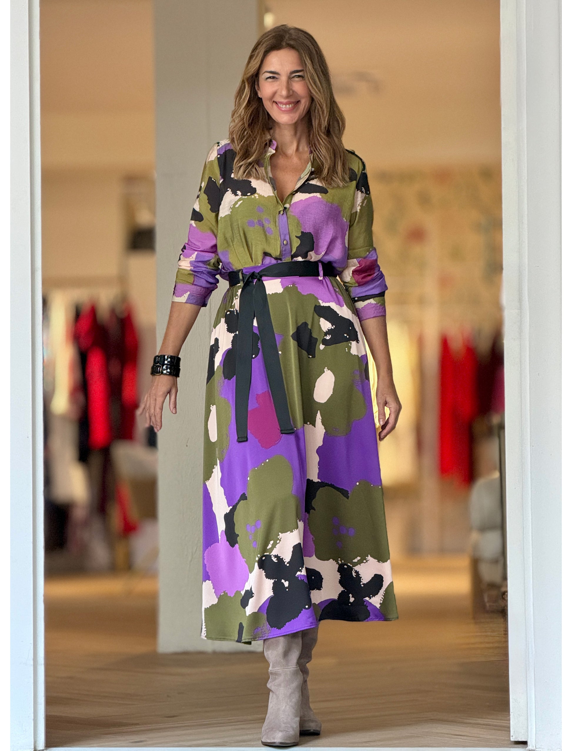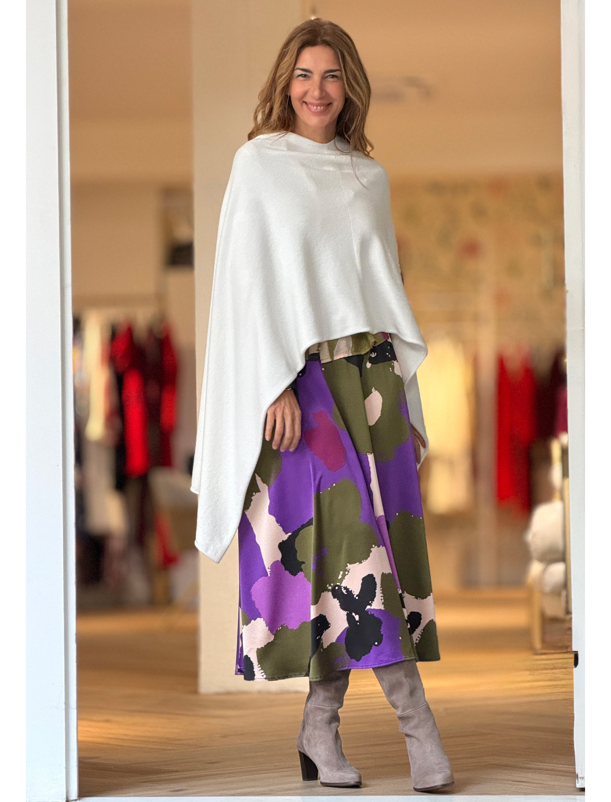 Falda Fluida Bonita confeccionada en tejido fluido, ligero y con una caída suave que aporta movimiento al caminar. Con un estampado colorido, en tonos morado, negro, verde y beige. Presenta un corte fluido, que se adapta a la cadera, resulta ideal tanto para looks de diario como para conjuntos más arreglados, combinada con blusas, jerséis o chaquetas. Incluye cinturón negro (el de la imagen).