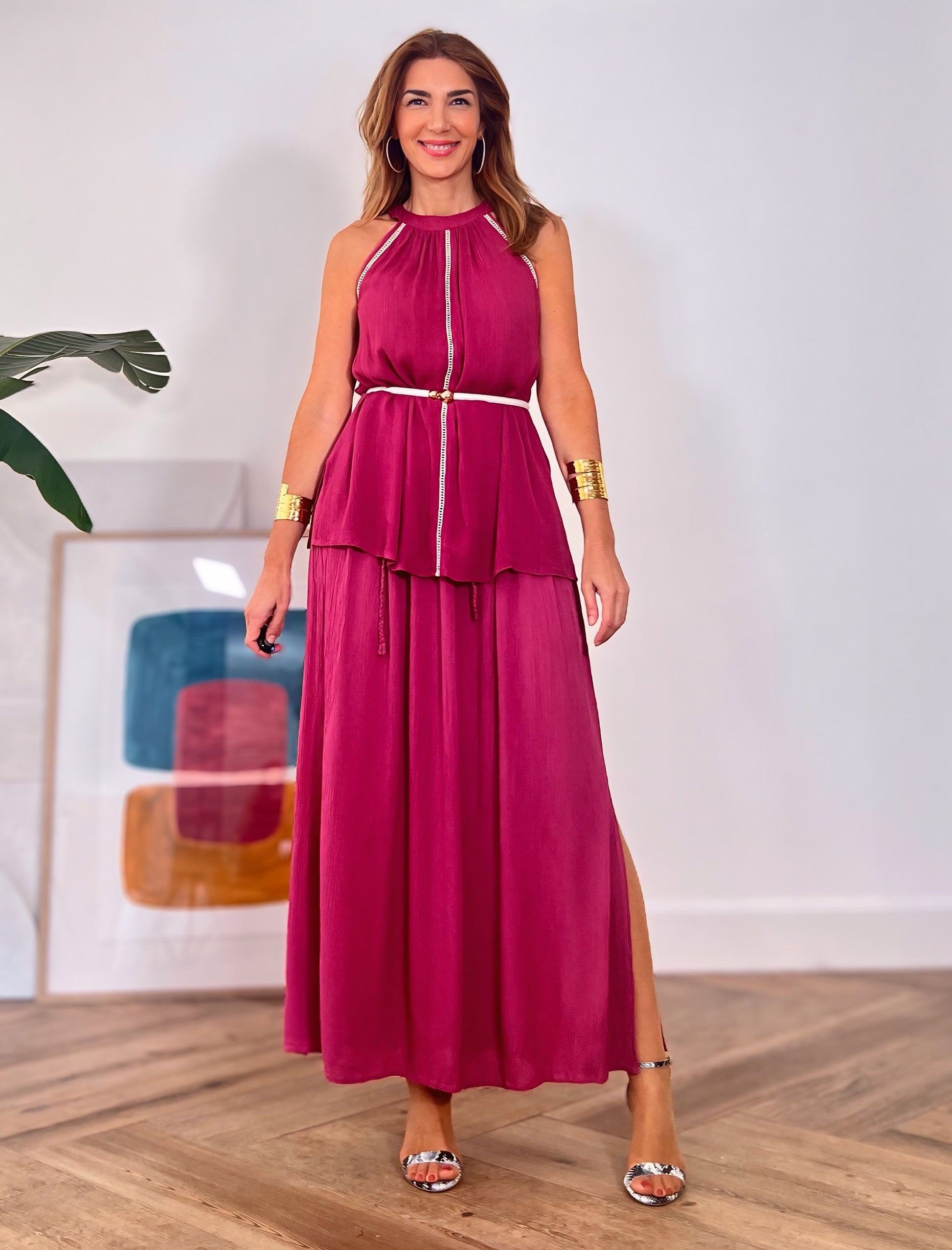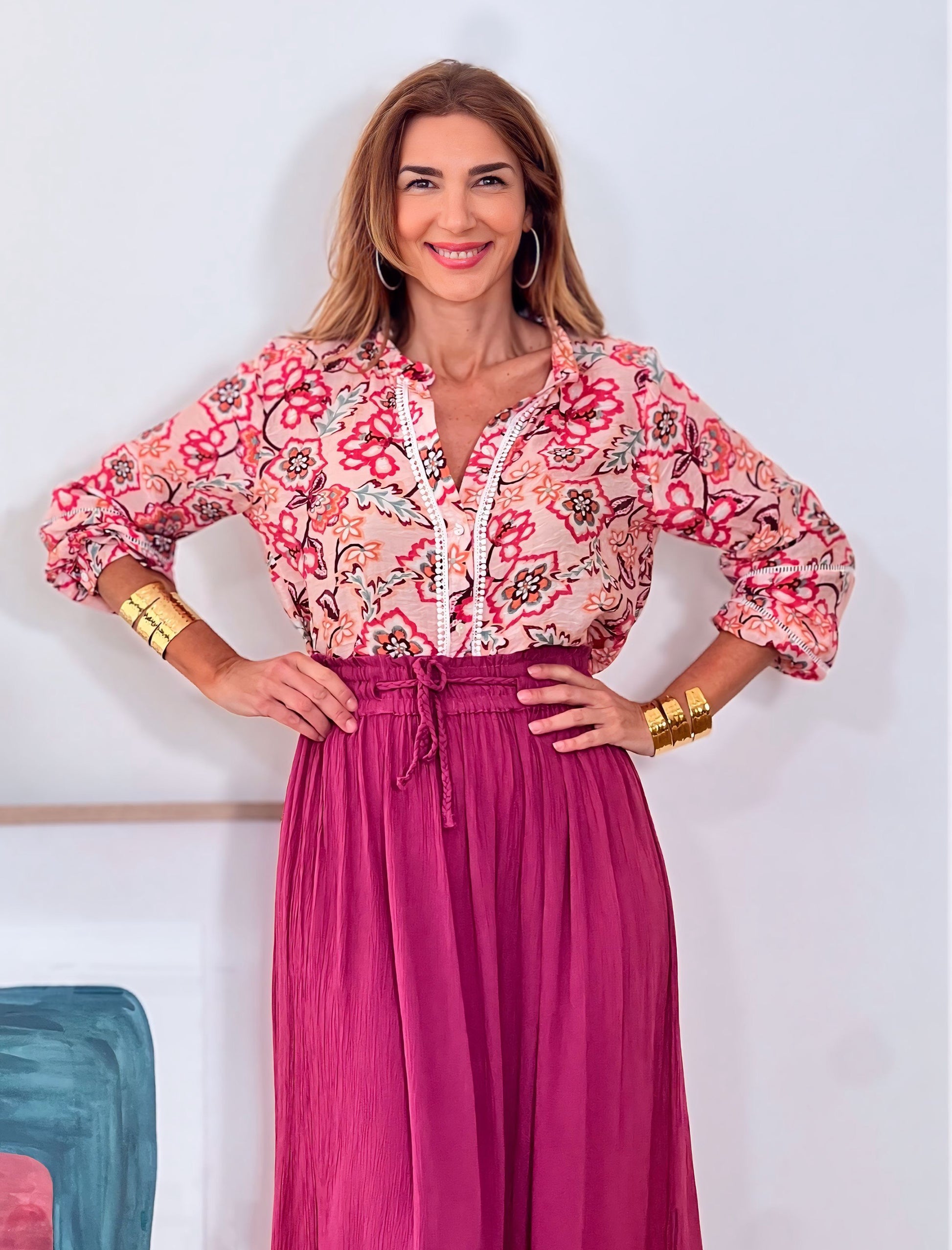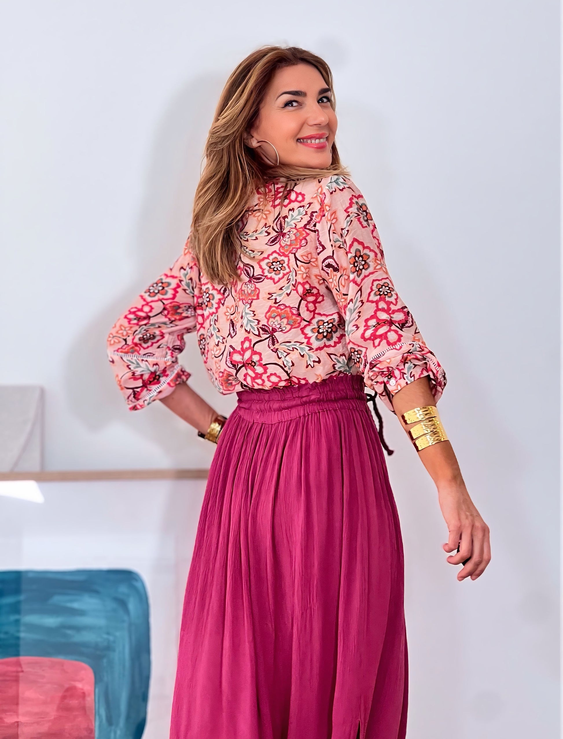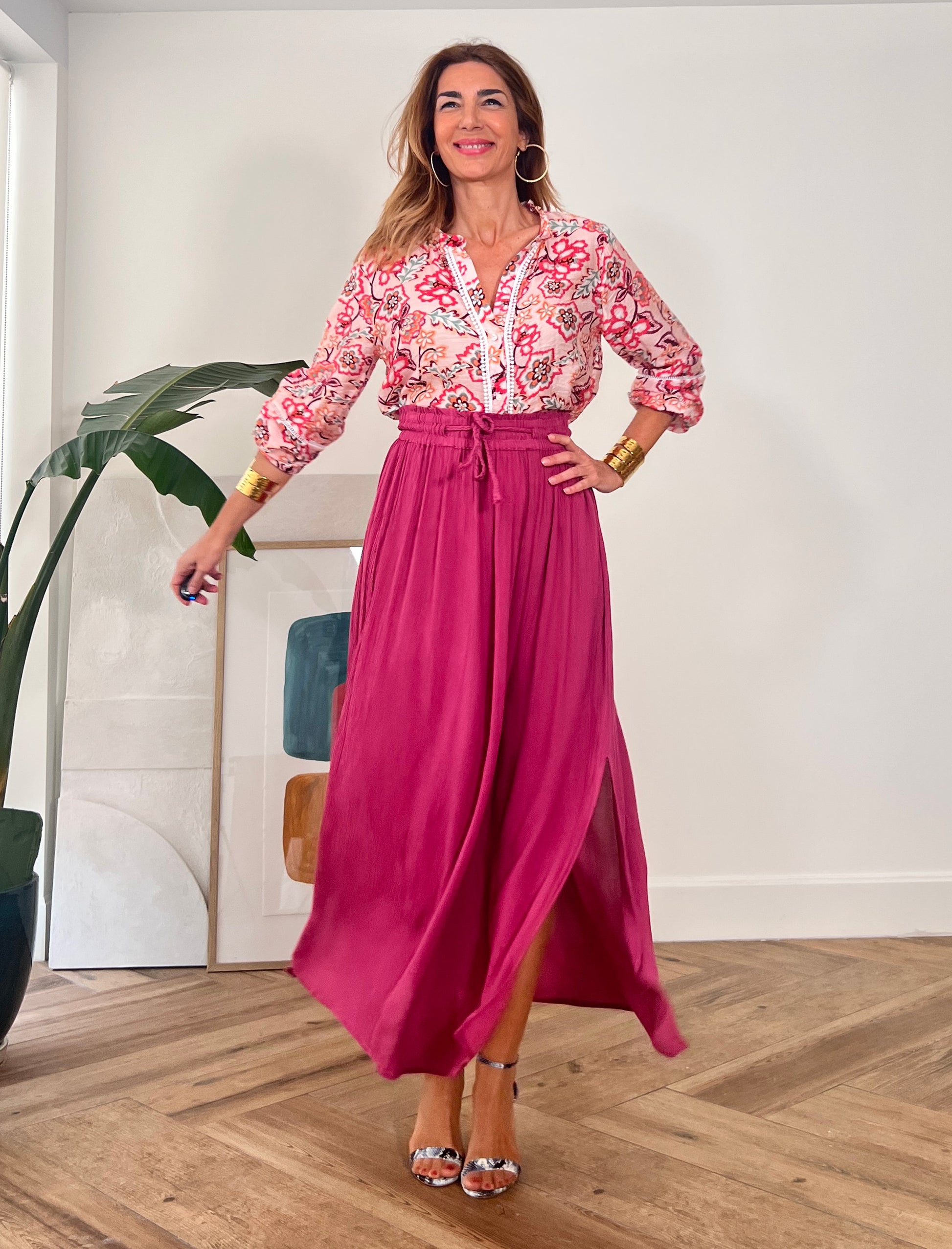 Falda Rosé de viscosa está confeccionada en viscosa de gran caída, lo que le aporta un movimiento fluido y un tacto suave. Su tono rosa realza cualquier combinación y su corte alarga visualmente la silueta.