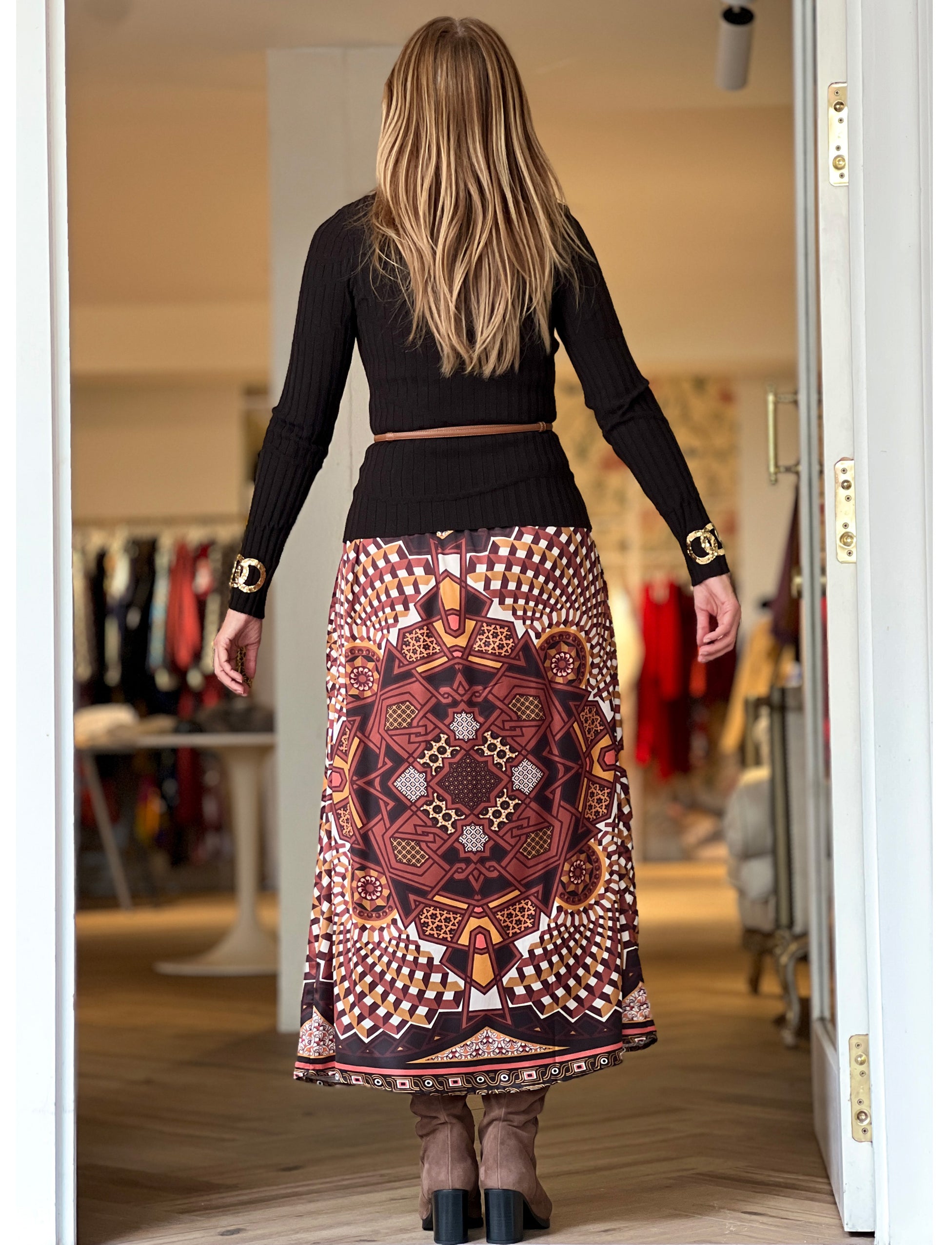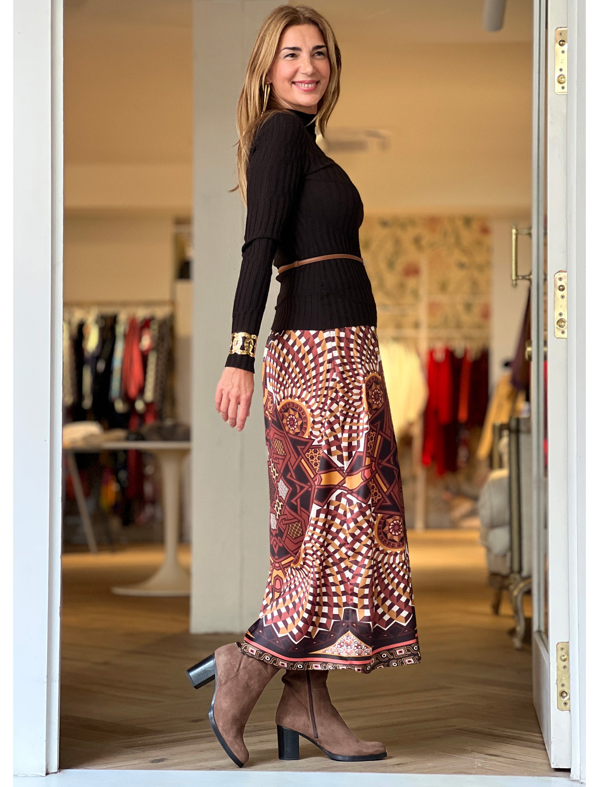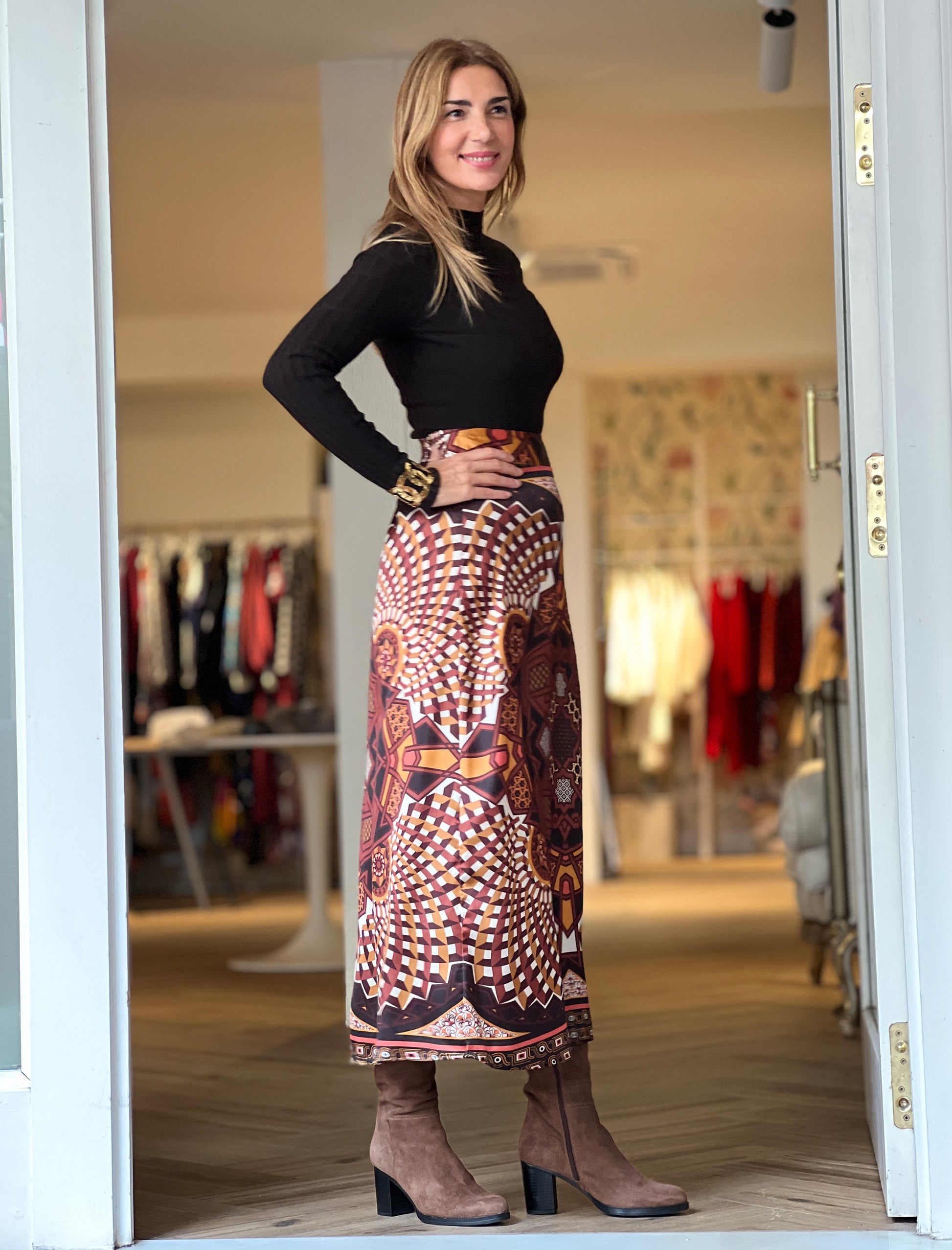 La Falda Maravillosa Mosaic combina un estampado geométrico tipo mosaico en tonos cálidos como marrones, ocres y teja, y está confeccionada en tejido fluido, que se adapta al cuerpo con una caída natural. Se puede combinar fácilmente tanto con blusas fluidas como con jerséis ajustados o camisas.