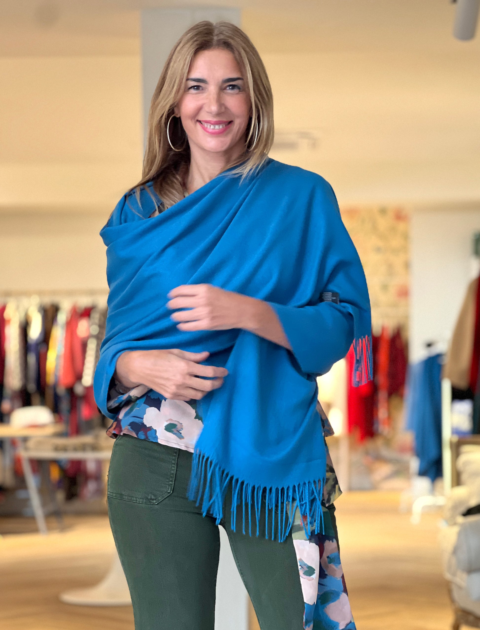Foulard Cashemir Azul Noche combina una mezcla de viscosa, cashemir y lana que ofrece una textura agradable y envolvente, perfecta para para llevarlo como chal sobre los hombros o foulard alrededor del cuello. Su tono azul noche aporta elegancia y luminosidad a los looks de diario o de evento, convirtiéndose en un básico atemporal de fondo de armario.