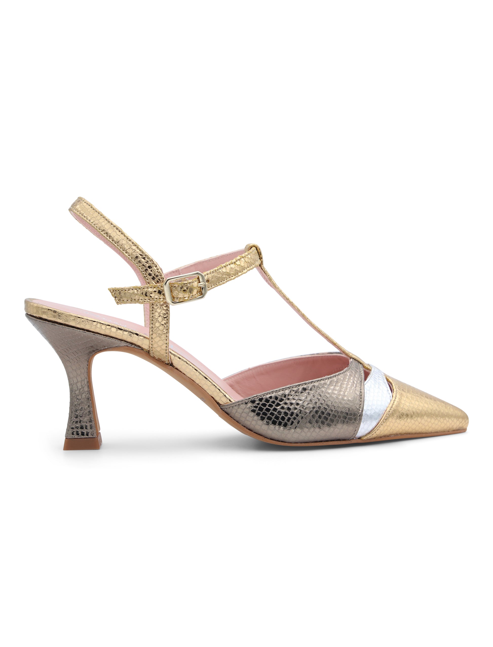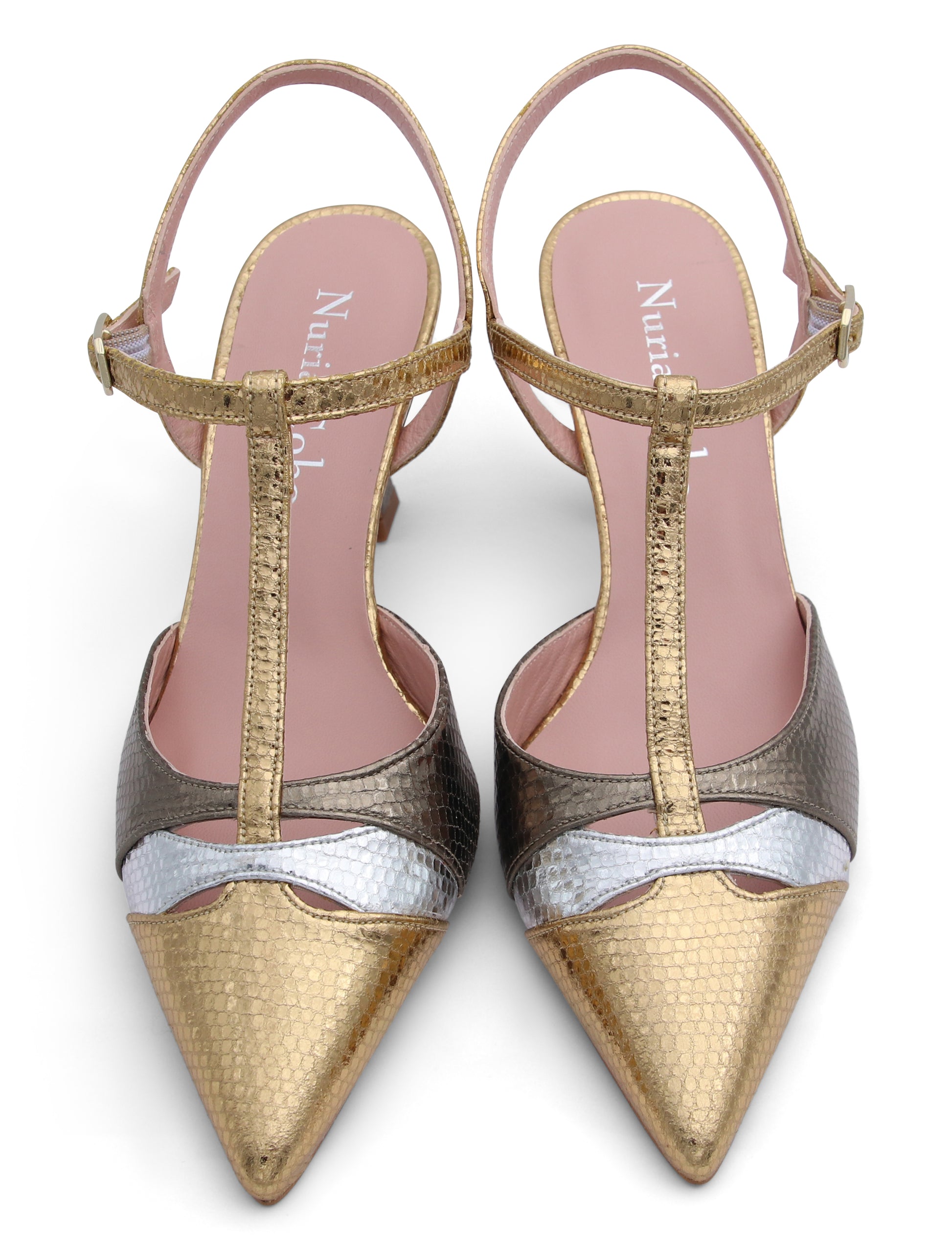 Salón destalonado combinado con pieles metalizadas en bronce, oro y plata,está fabricado artesanalmente con las mejores pieles y es especialmente cómodo ya que tiene piso de goma y planta acolchada y una horma que sujeta perfectamente el pie.