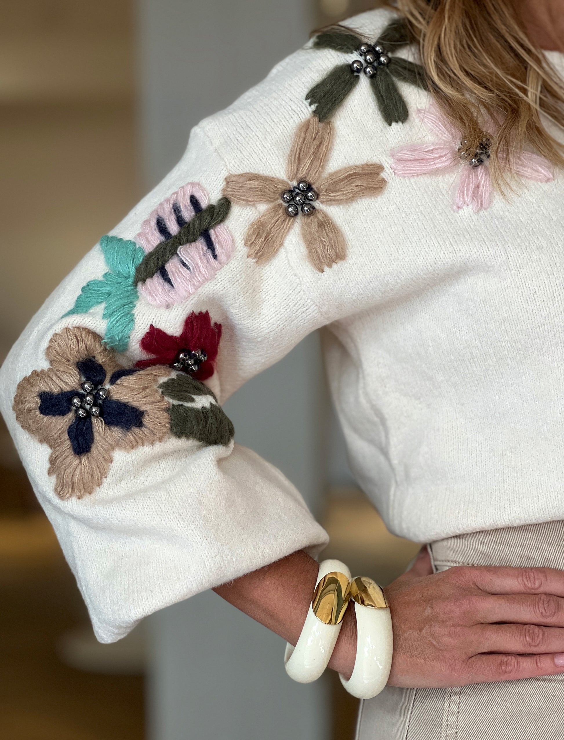 Jersey Bordado Precioso Beige de corte amplio y suave caída destaca por sus mangas abullonadas terminadas en puño elástico, bordadas con estampado floral en tonos vivos. Su diseño versátil lo convierte en un fondo de armario especial, ideal tanto para looks diarios como para algún evento especial, combinado con tu falda favorita.