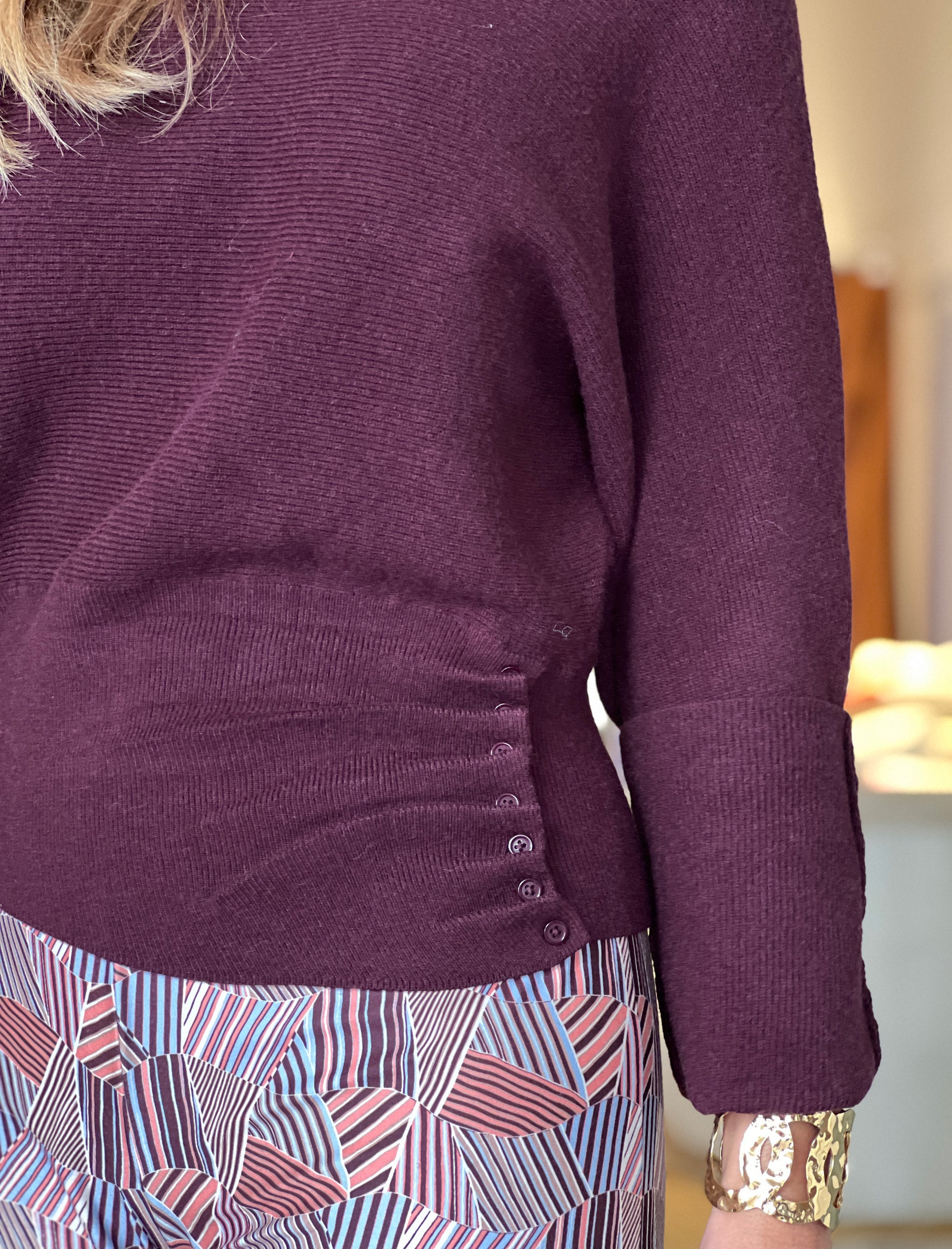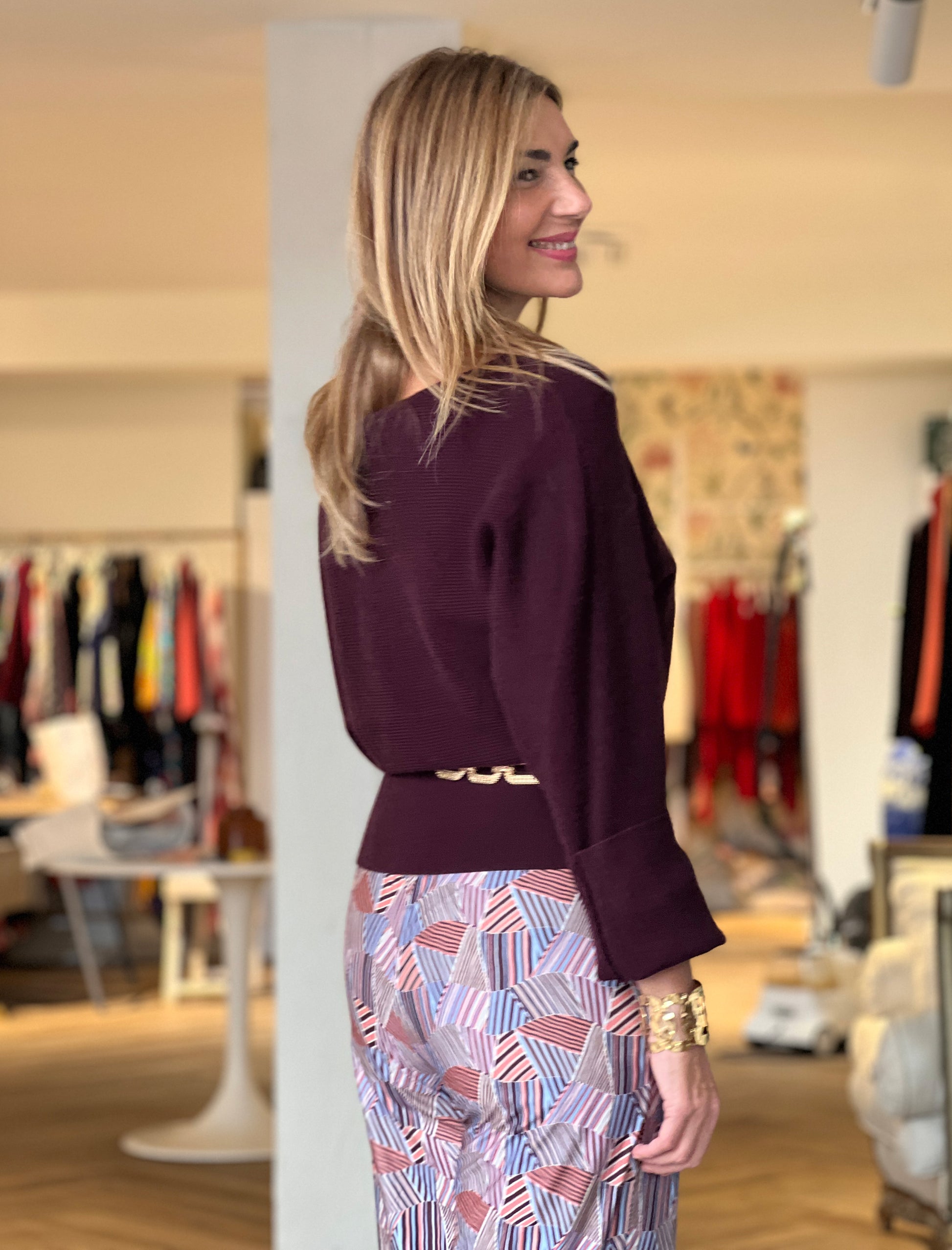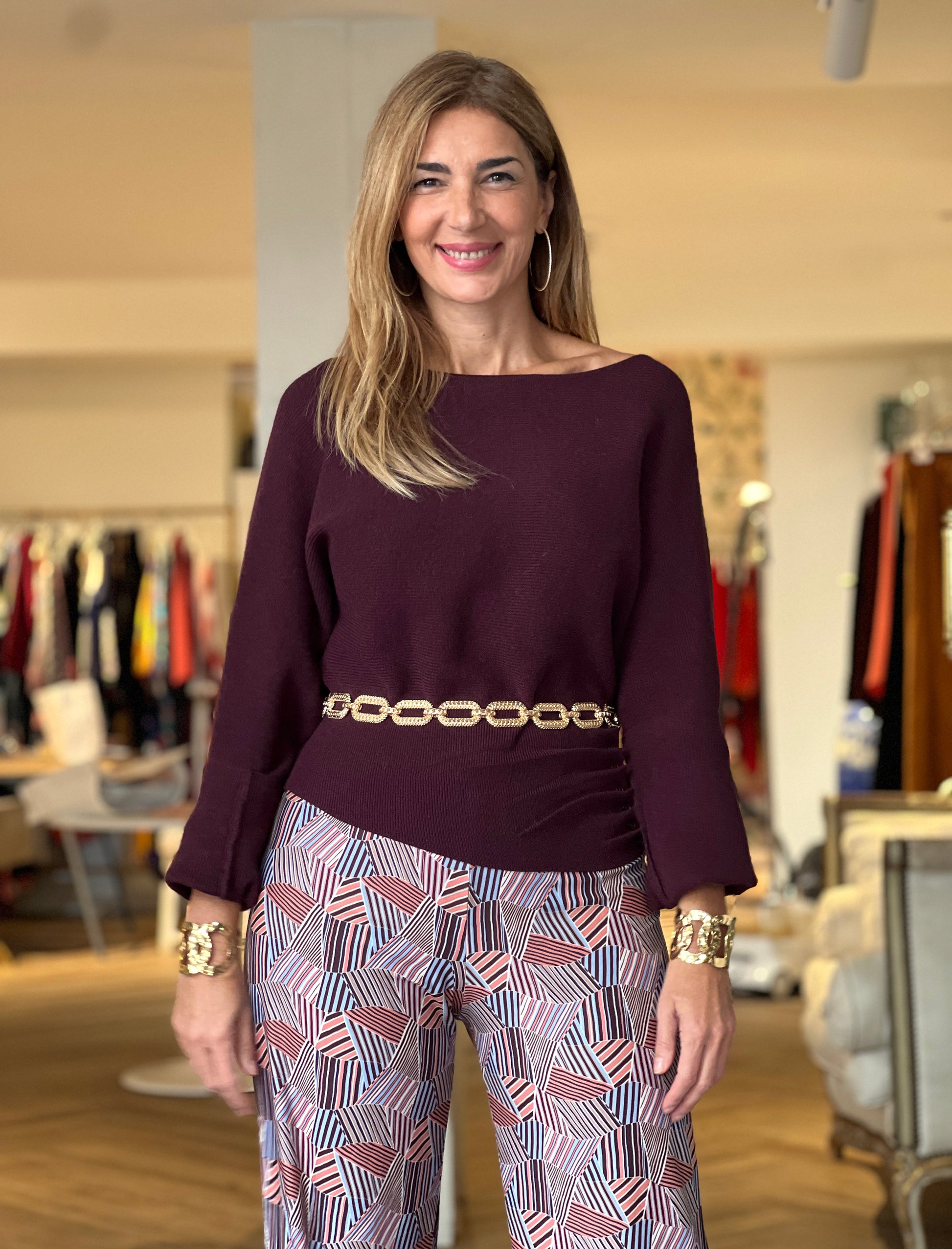 El Jersey Burdeos presenta un corte recto con caída fluida y un fruncido de botones en la cintura, cuello redondo y puños ligeramente ajustados, lo que realza la silueta y eleva el look. Ideal para combinar con pantalones estampados o faldas midi, tanto en outfits casuales como más sofisticados.