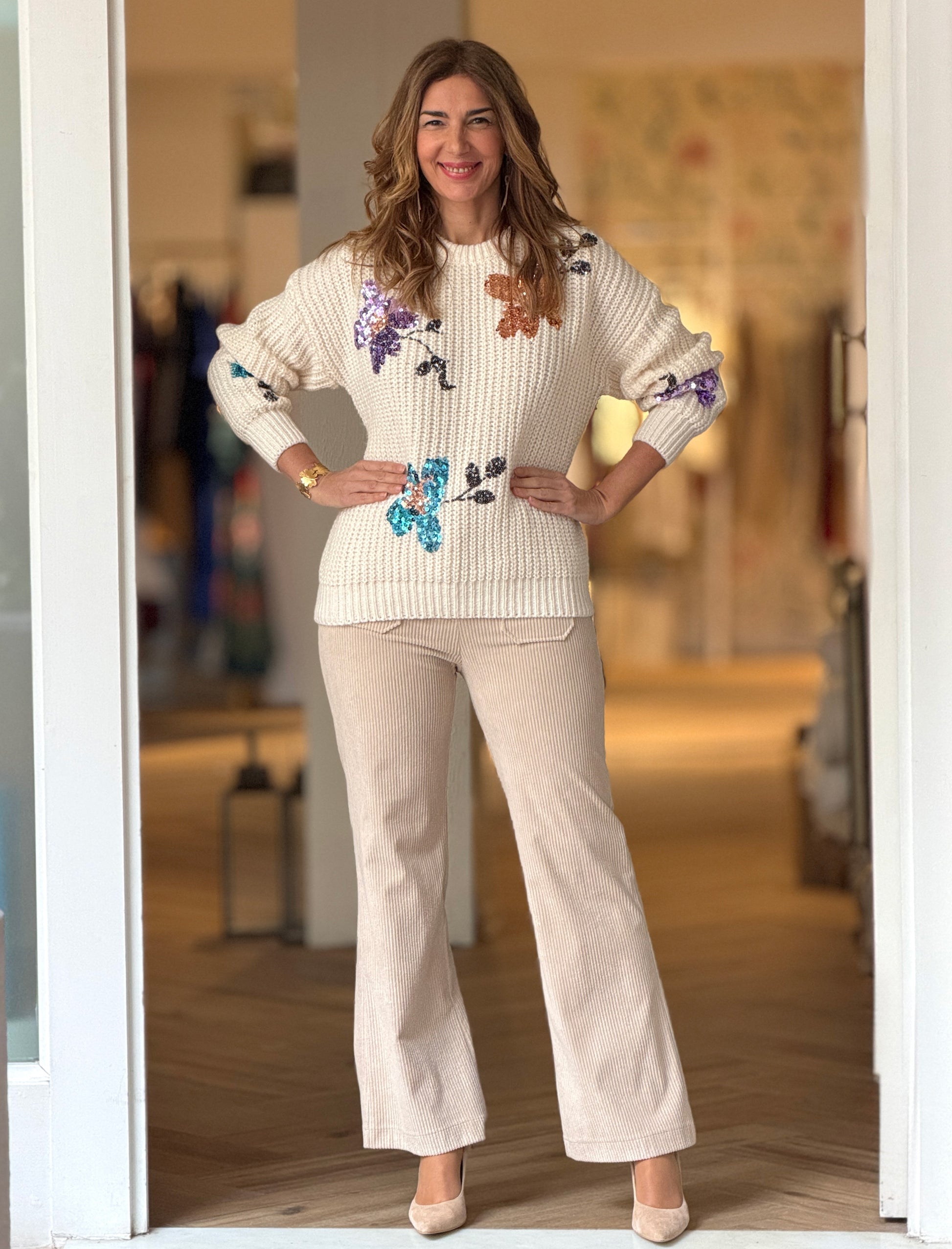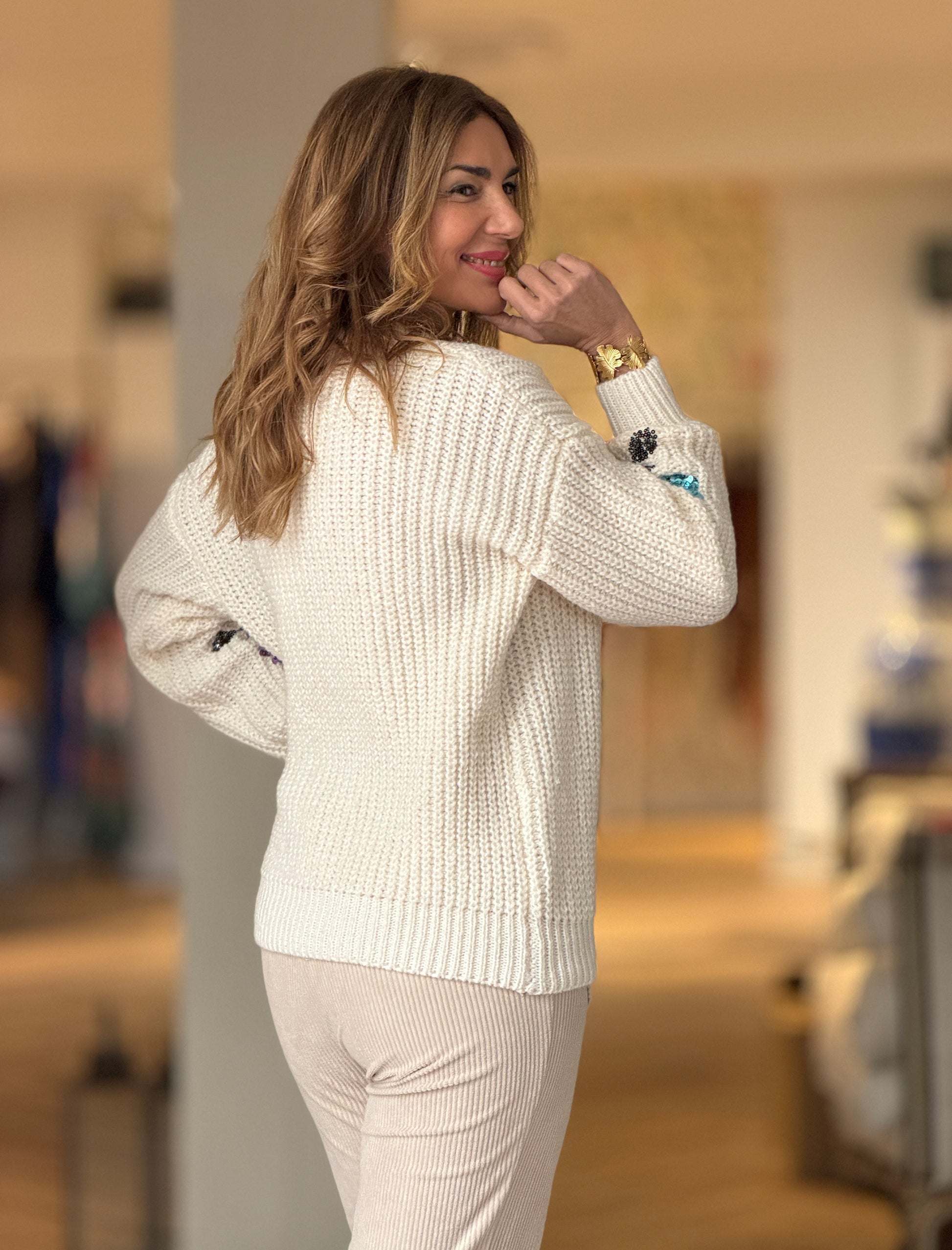 Jersey Floral tiene una base beige clara muy fácil de combinar y unos detalles florales de lentejuelas que le dan ese punto diferente que hace que no sea un jersey básico. Tejido en un punto cómodo que abriga, perfecto para llevar con vaqueros, pantalones arreglado o incluso faldas. Es uno de esos jerseys que te pones mucho porque siempre queda bonito.