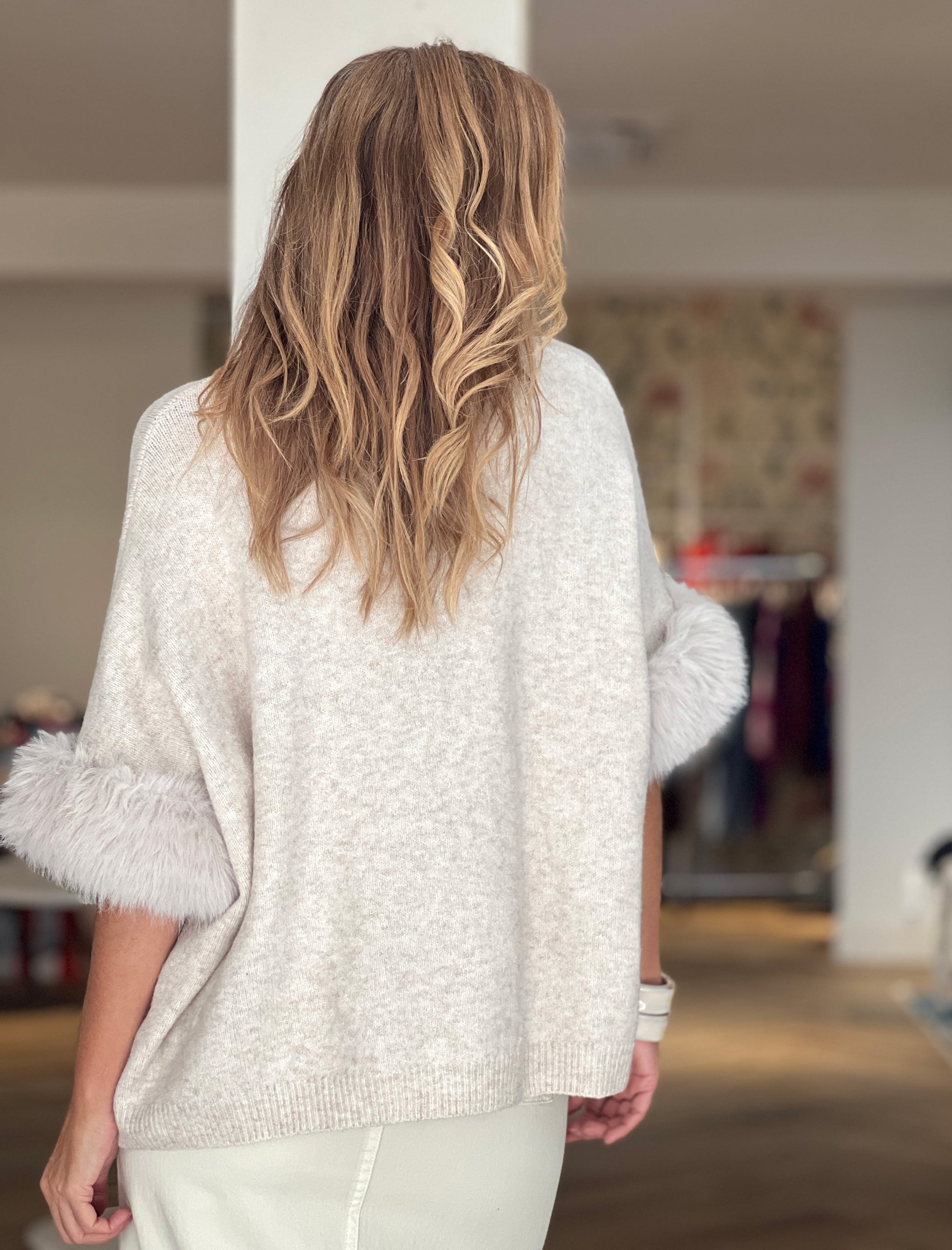 Jersey glamour claro de punto en tonos claros con detalle de pelo en las mangas, que aporta un toque chic y actual. Su corte recto y tejido ofrecen comodidad sin, ideal para looks elegantes o casual chic. Perfecto para combinar con pantalones claros o faldas midi y crear un contraste.