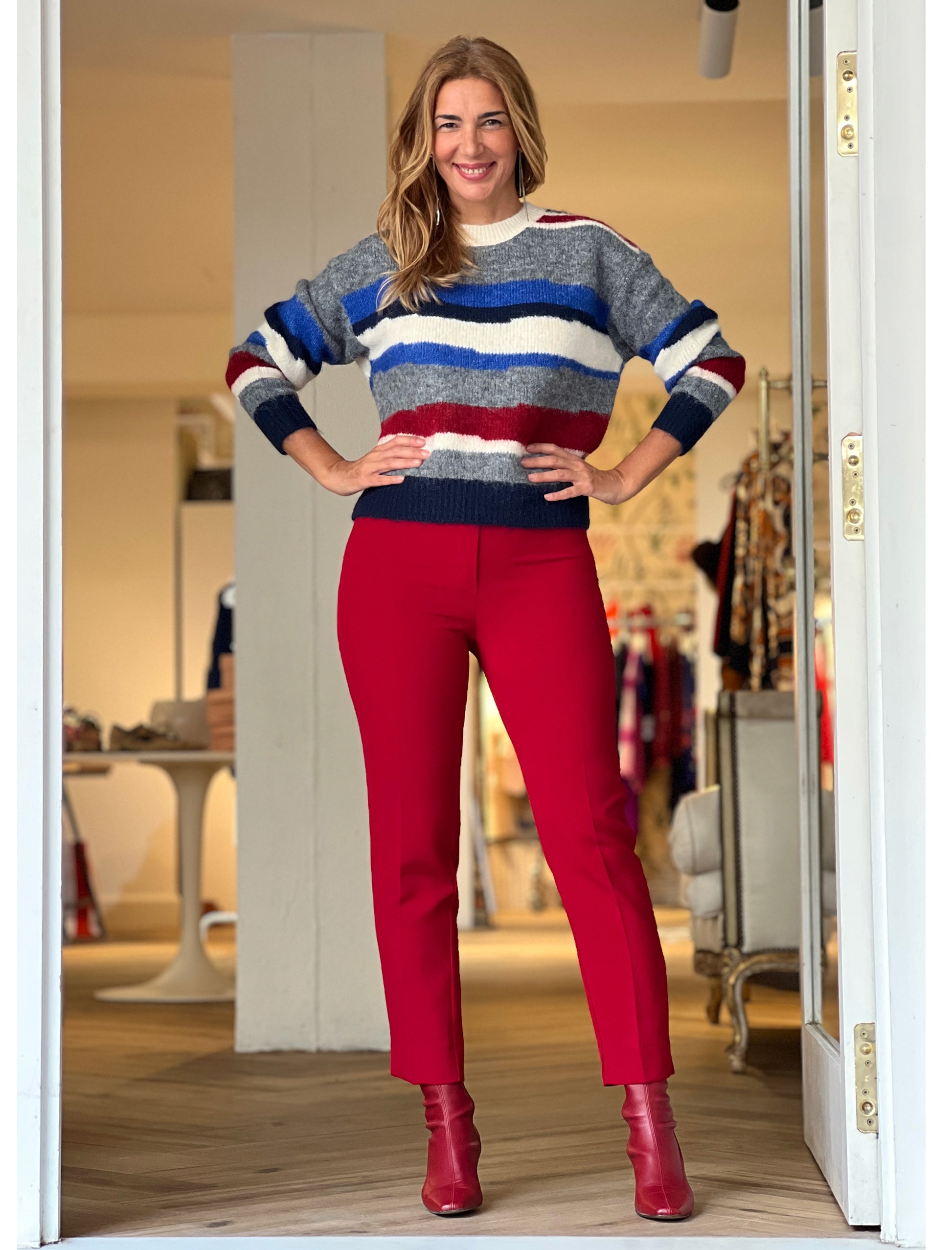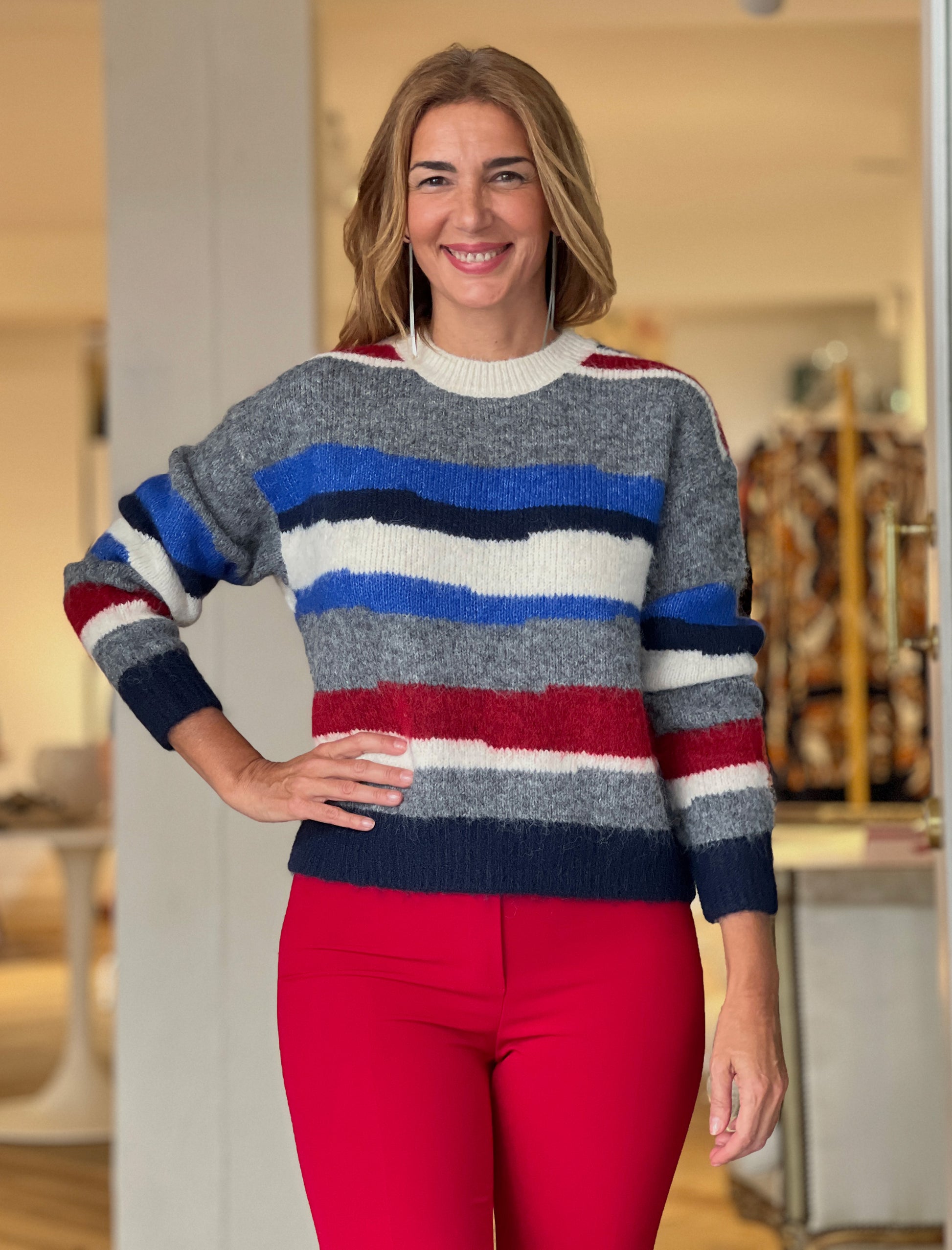 Jersey Ideal Distinto de punto suave con diseño de rayas en tonos gris, azul, blanco y burdeos. Su corte recto y cuello redondo aportan comodidad y favorecen la silueta sin perder estilo. Es un básico versátil para combinar con pantalones, faldas o jeans, perfecto para dar un toque distinto y actual a tus looks diarios.