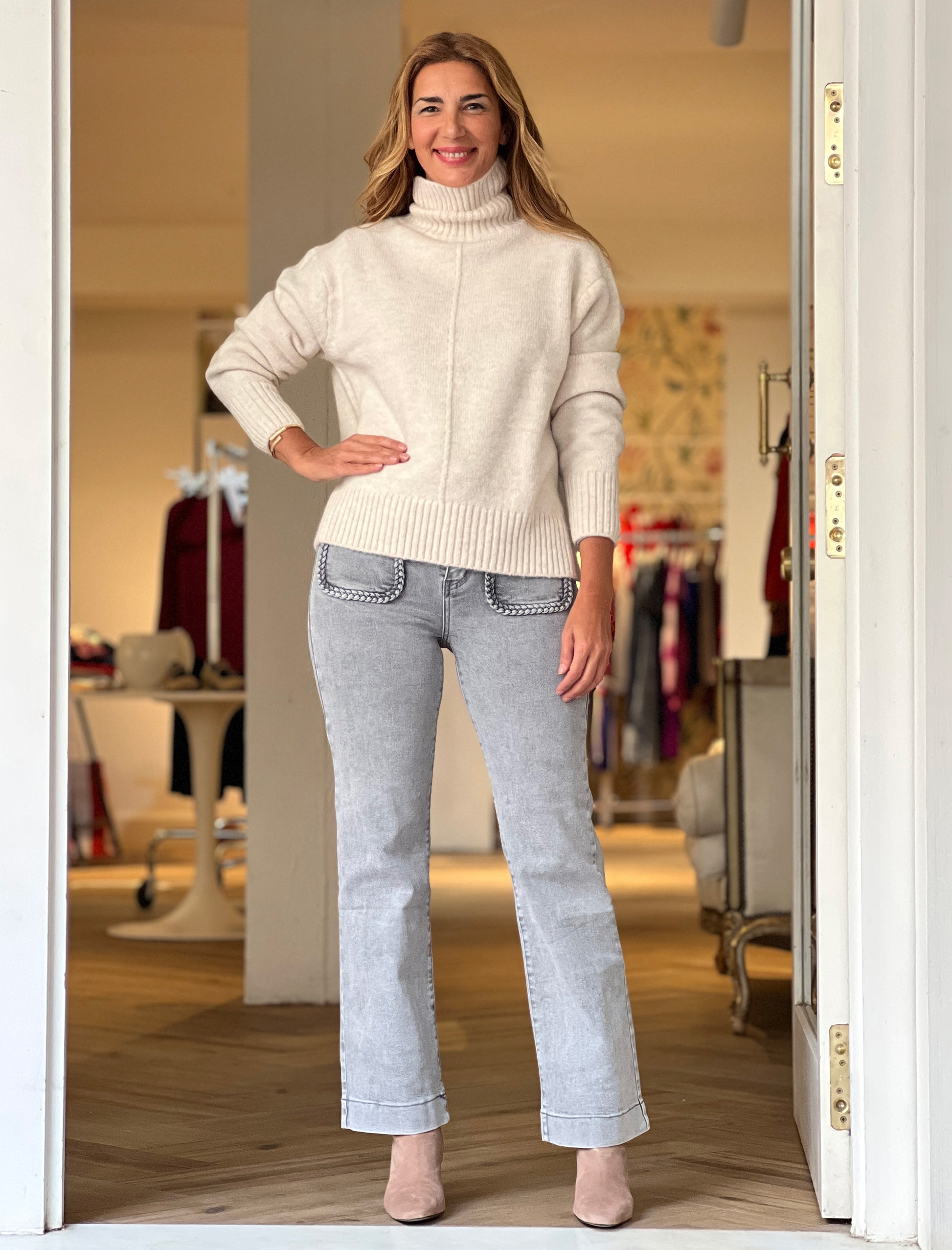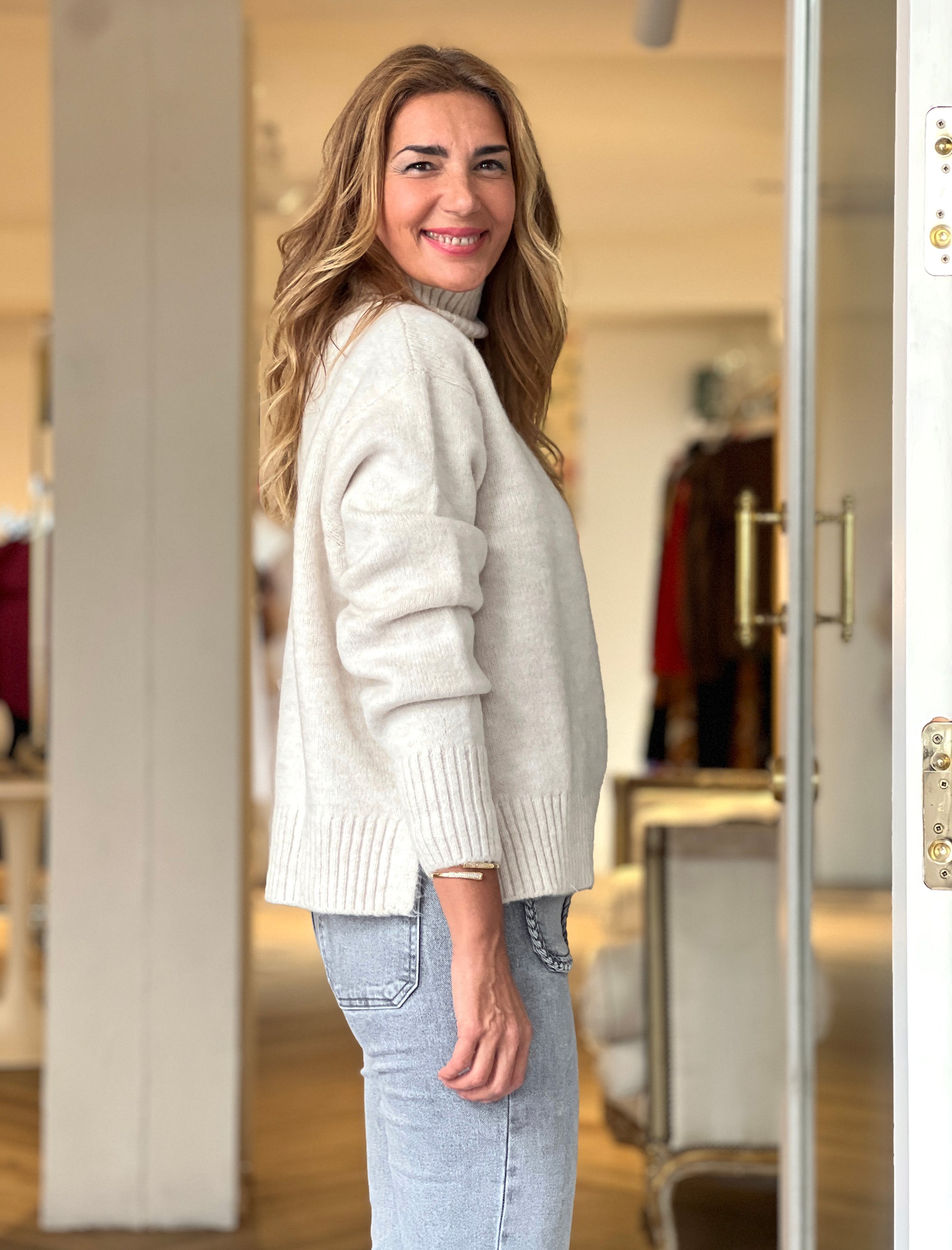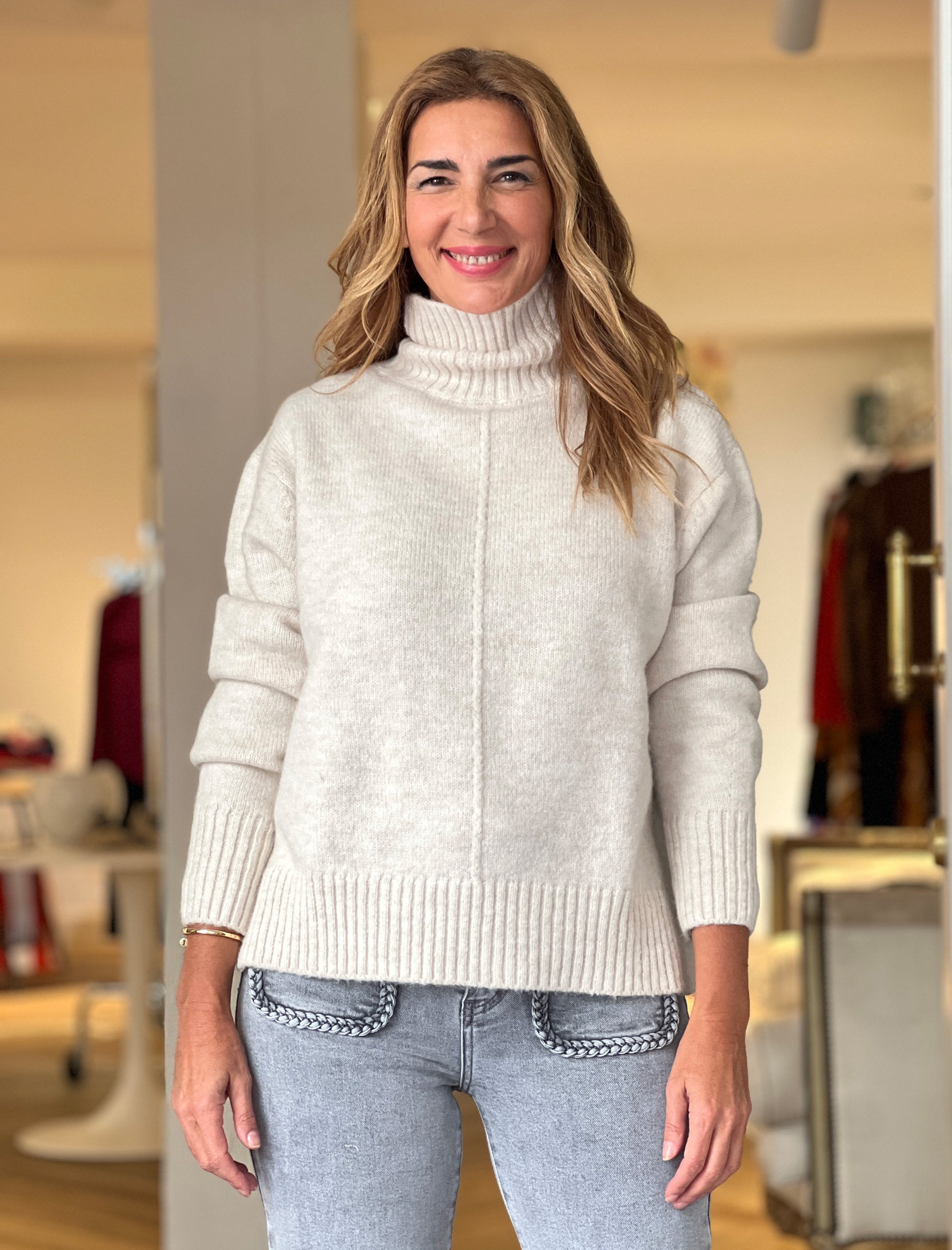 El Jersey Suave Ideal Beig de punto color beige con cuello alto y corte recto. Presenta caída fluida y tacto suave. Su diseño básico y atemporal permite combinarlo fácilmente con pantalón o vestido. Es una prenda básica imprescindible en cualquier armario, perfecta para crear looks sofisticados con facilidad.