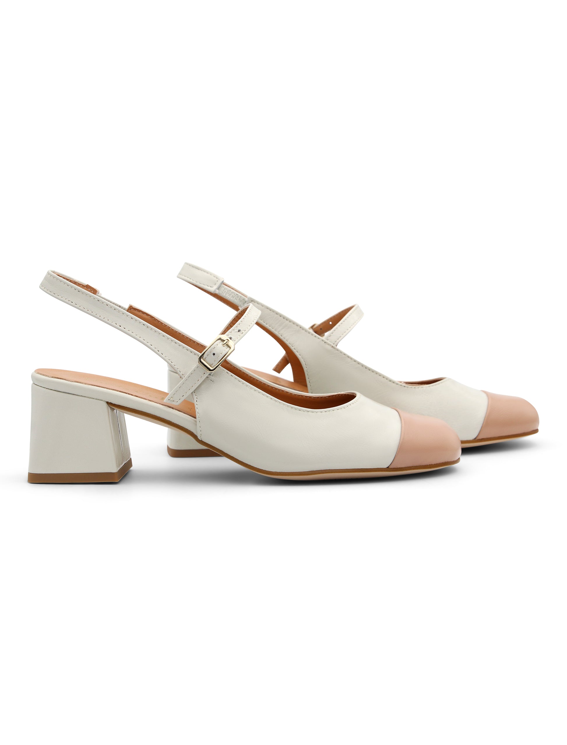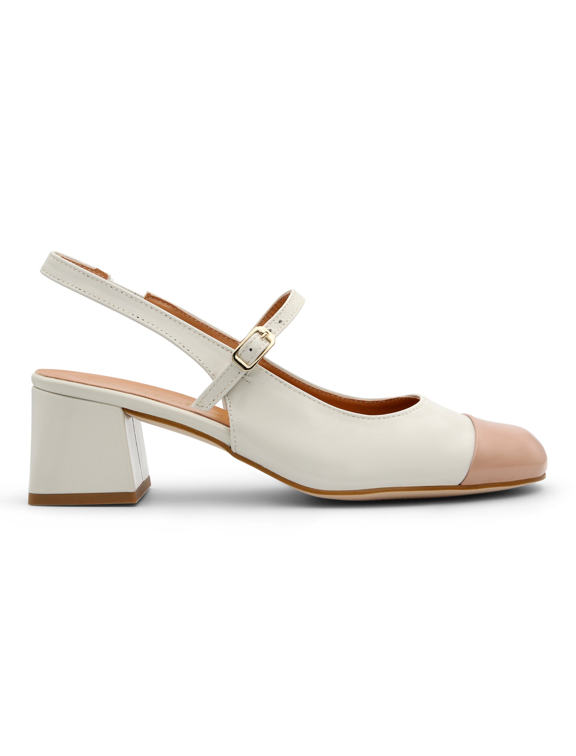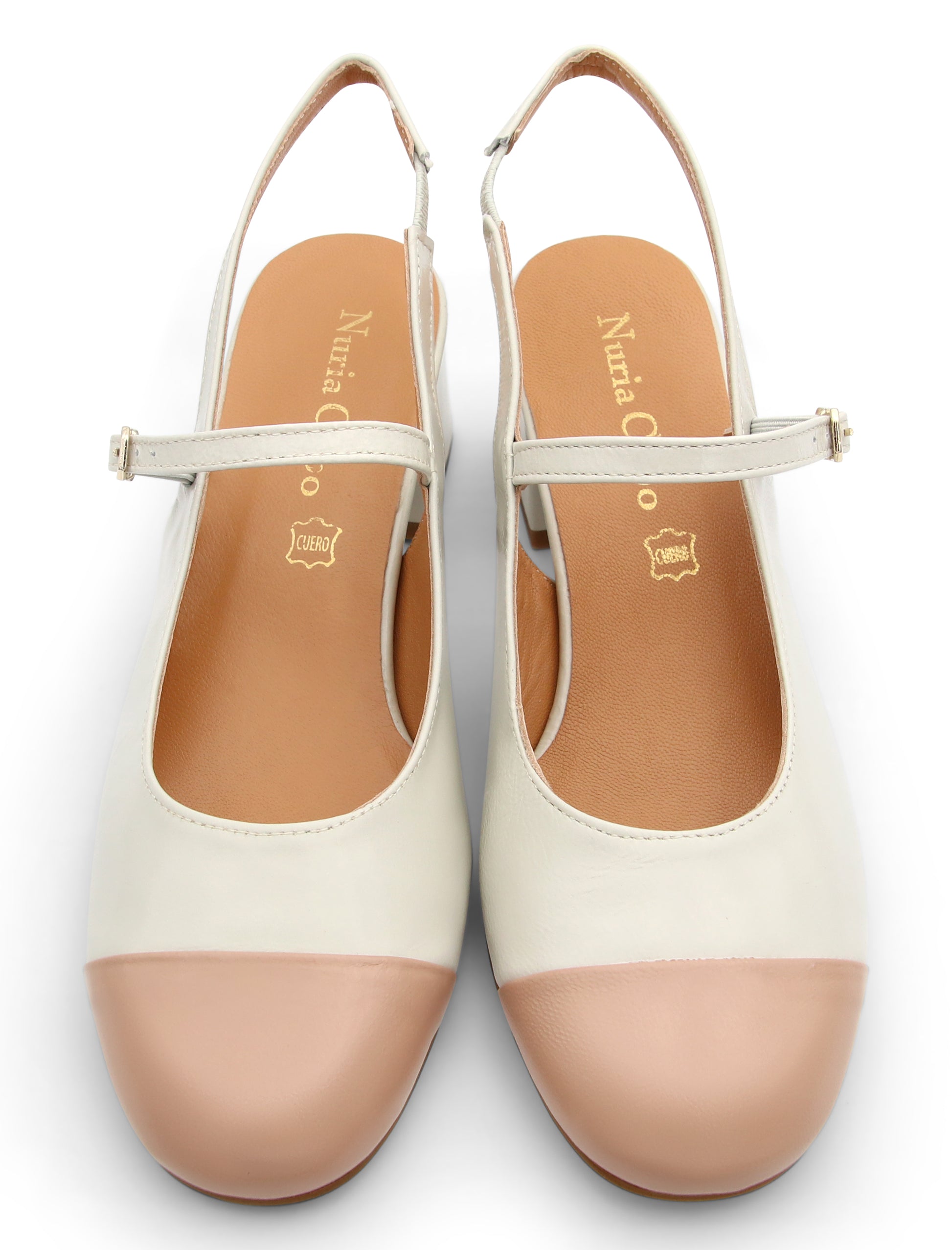 Mary james en color blanco roto con punta en beige, de tacón medio Nuria cobo.Esta fabricado artesanalmente en talleres españoles integramente en piel , es un zapato perfecto para eventos por su comodidad, y también para looks más casual que va con todo.
