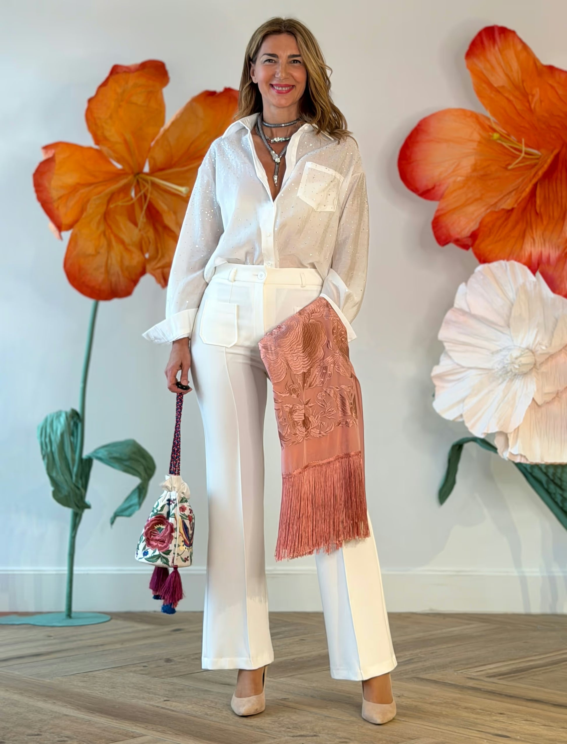 Pantalón ideal de bolsillos blanco está confeccionado en tejido que aporta elasticidad y comodidad. Su corte recto con caída estiliza la pierna. Incorpora cremallera y botón delantero, dos bolsillos delanteros y posibilidad de usarlo con o sin cinturón. Es una prenda versátil y fácil de combinar para uso diario o profesional. Si lo combinas con la chaqueta Slim en blanco, obtienes el traje ideal: femenino y actual
