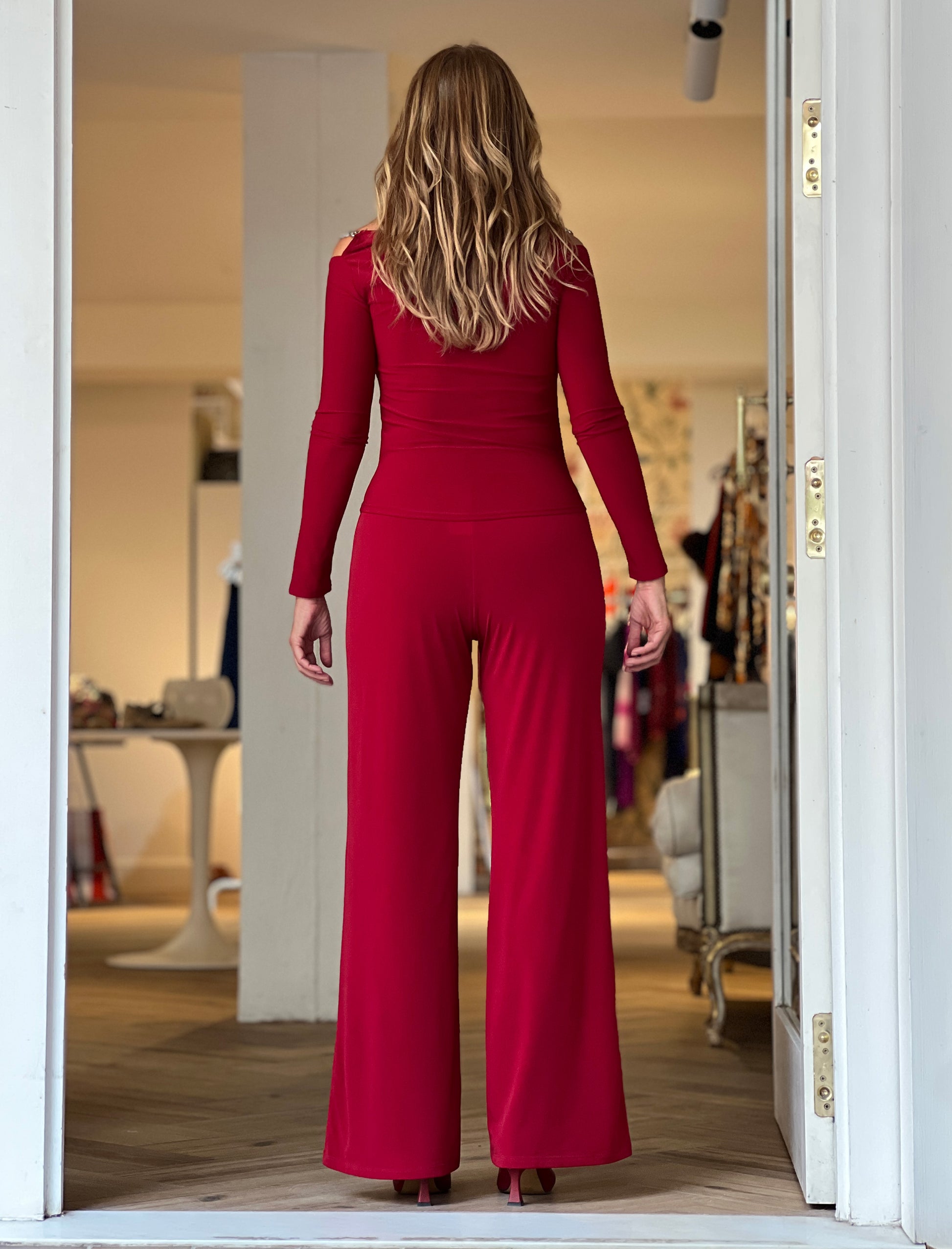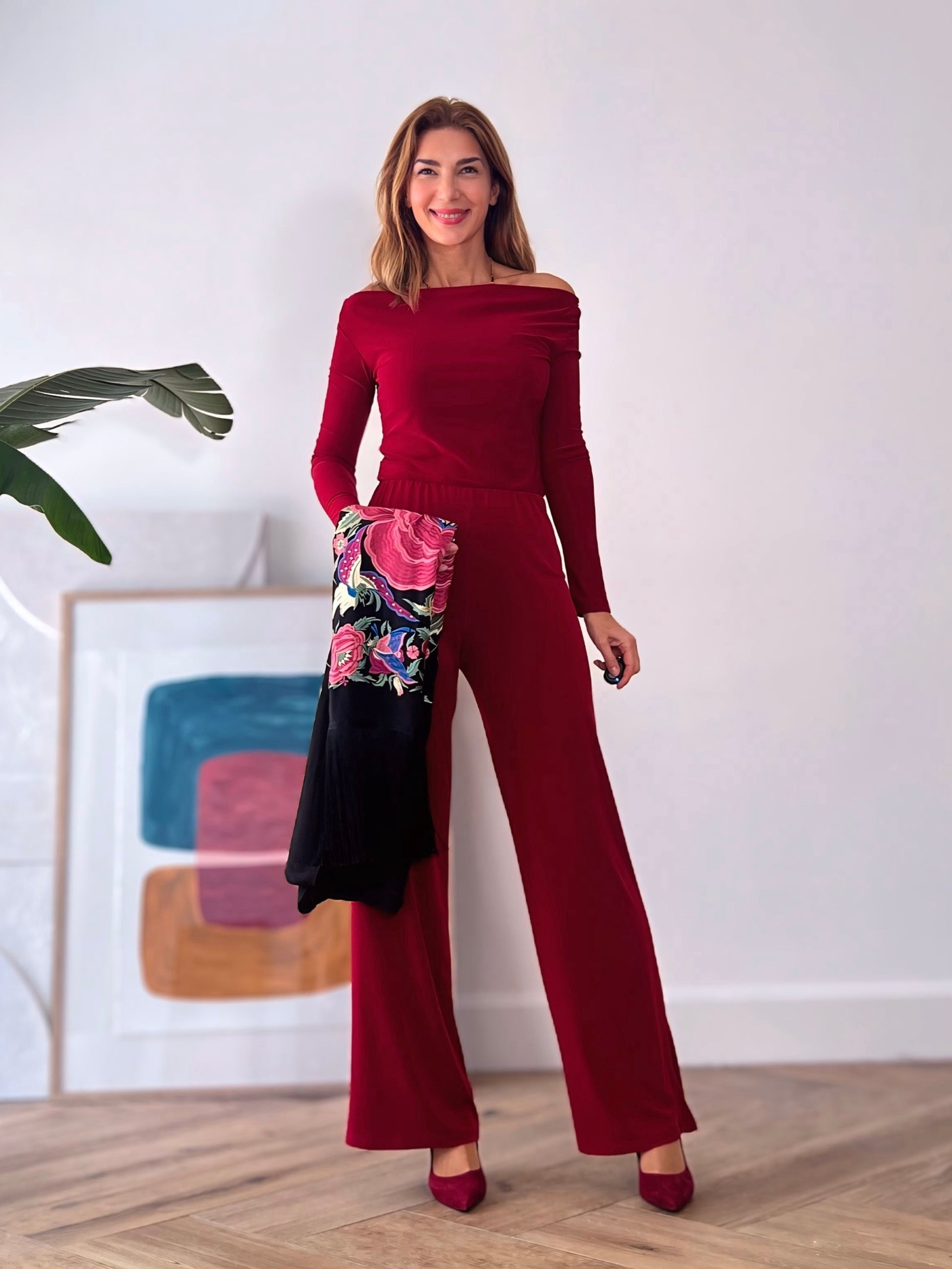 Pantalón Soft Favorecedor Burgundy está confeccionado en tejido que aporta suavidad, caída fluida y elasticidad para un ajuste cómodo y estilizador. Su diseño recto con cintura alta y pernera ligeramente ancha alarga visualmente la silueta y resulta ideal para combinar tanto con blusas como con chaquetas. El acabado en color burgundy es perfecto para looks de día en la oficina o para ocasiones especiales.