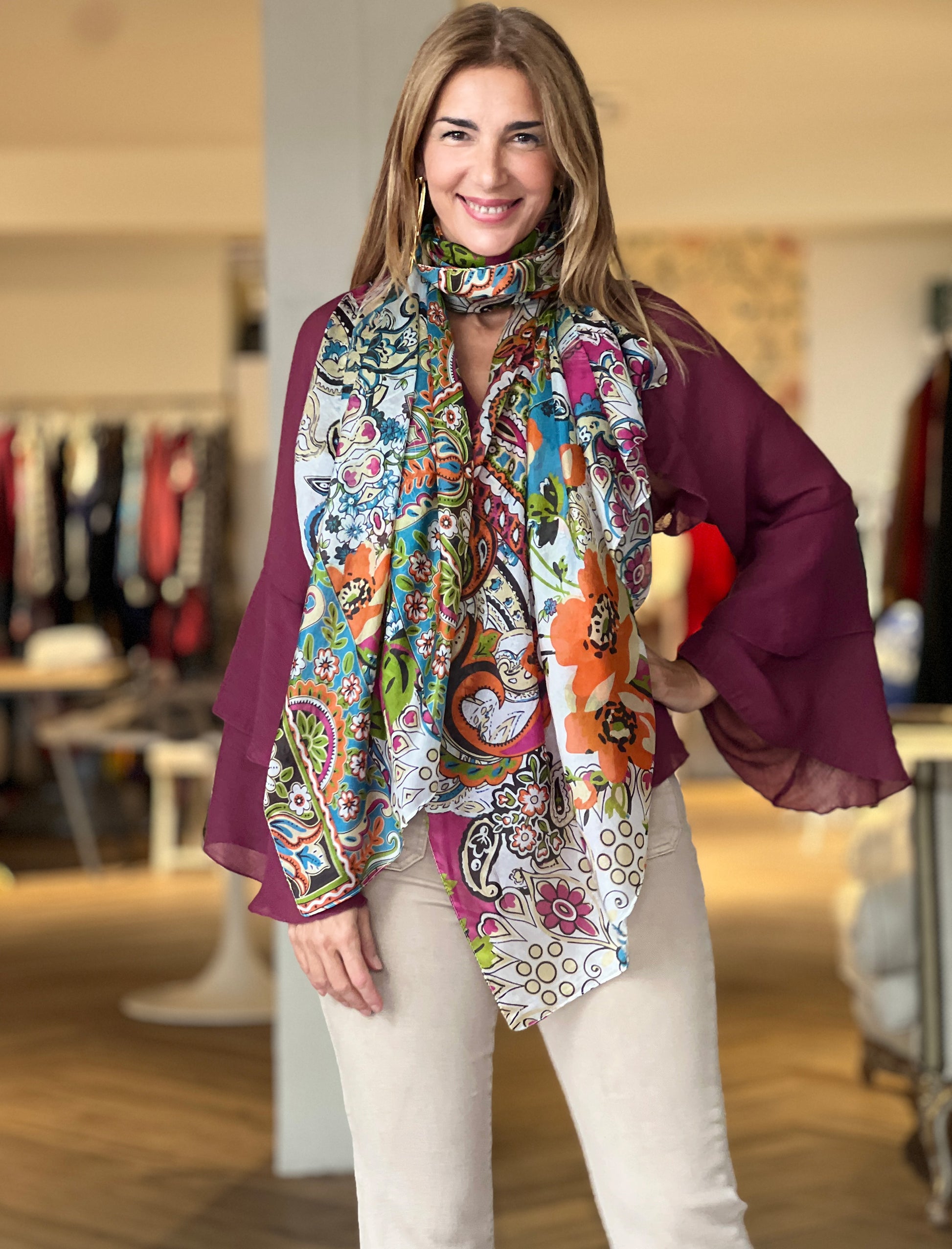 El Pañuelo de seda floral presenta un estampado multicolor que combina tonos vibrantes que aportan luz a cualquier conjunto, convirtiéndolo en el accesorio perfecto para elevar tu look. Ideal para combinar con blusas lisas, chaquetas o total looks monocromáticos, este pañuelo se convierte en el detalle que marca la diferencia.