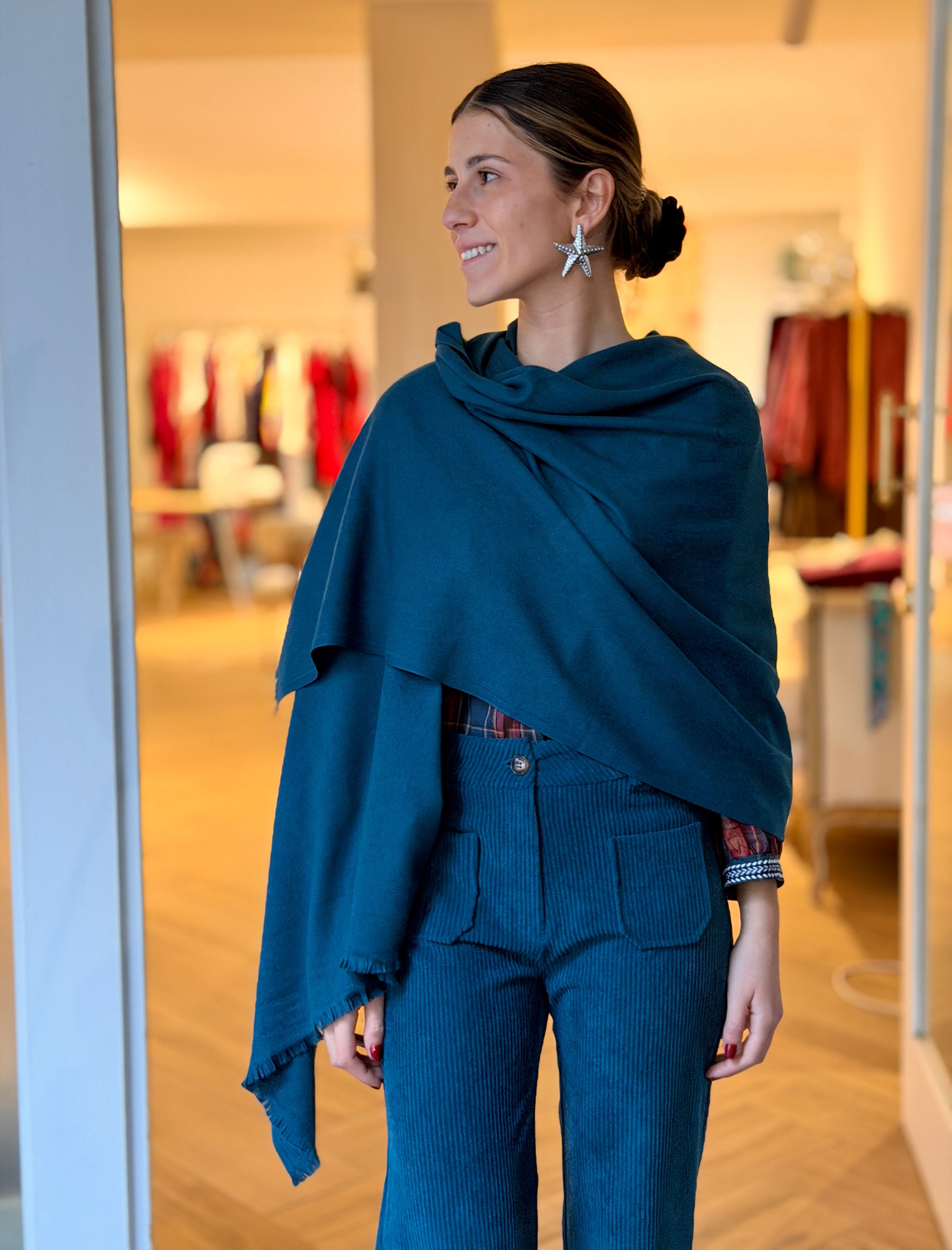 Este pañuelo foulard en color azul es una prenda versátil y elegante, perfecta para dar un toque de color sofisticado a cualquier look. Su tacto suave y fluido lo convierte en un accesorio imprescindible para el día a día, ideal tanto para llevar al cuello como sobre los hombros.