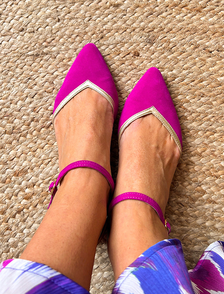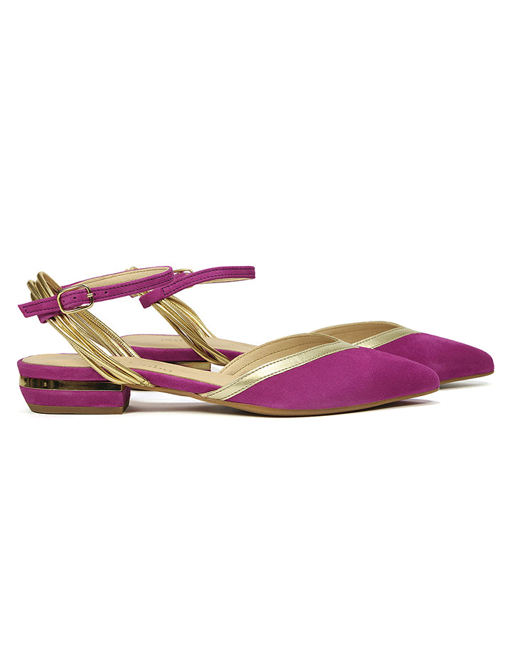 Estoy encantada de presentaros mi nueva bailarina Paulita. ¿No es para comérsela? Fabricada con las mejores pieles, combina piel ante y piel cromada en oro. Tiene una buena sujeción con hebilla y unas tiras doradas ideales.