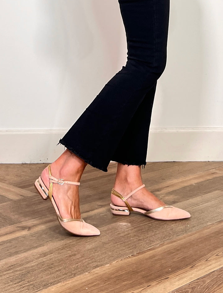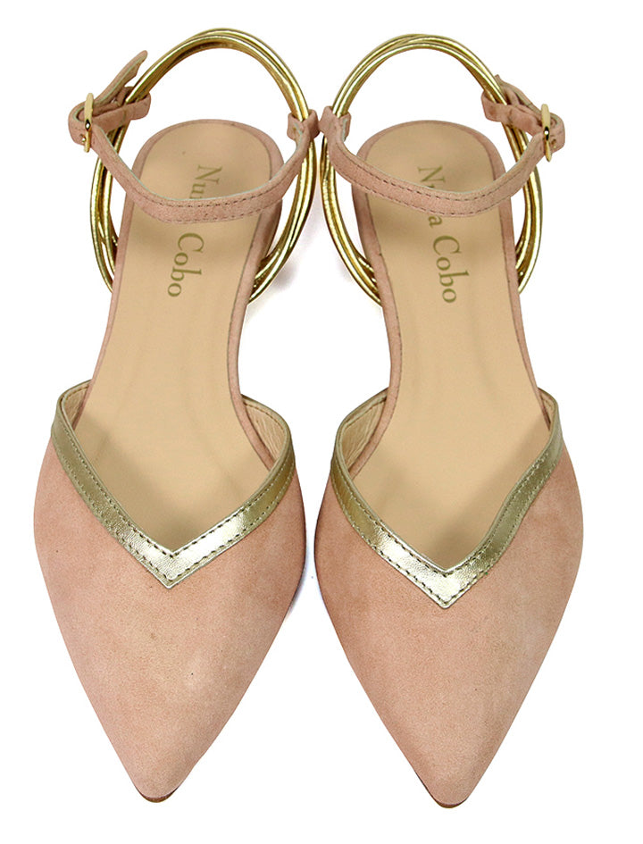 Fabricada con las mejores y suaves pieles, tiene suela de goma, planta súper acolchada y un tacón de 3 centímetros con un acabado en oro precioso.