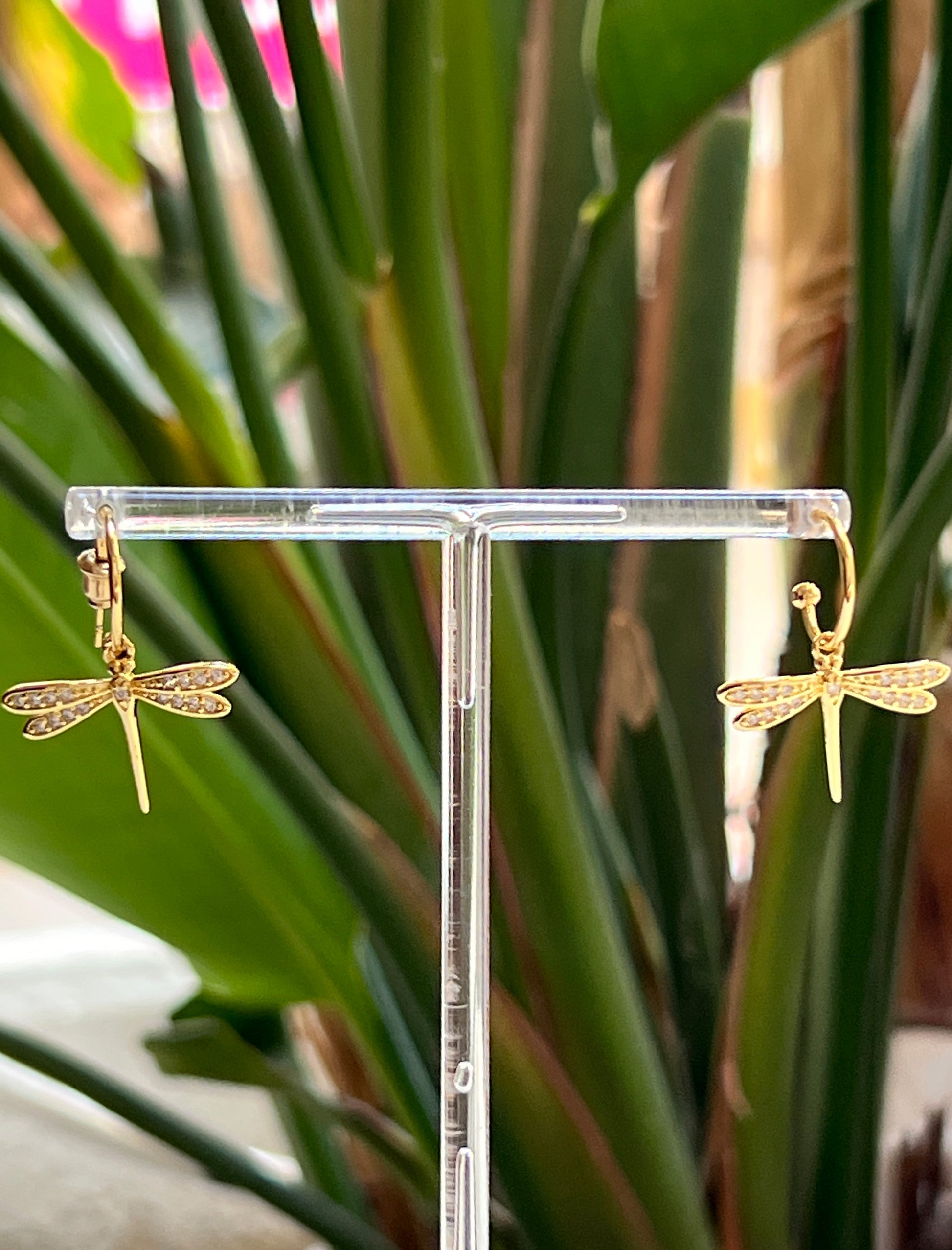 Pendientes Libélula presenta un acabado dorado suave en forma de libélula y alas finamente texturizadas con circonitas brillantes. Son un accesorio ideal para añadir un toque luminoso y femenino a cualquier look. Cierre de tornillo