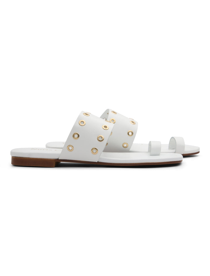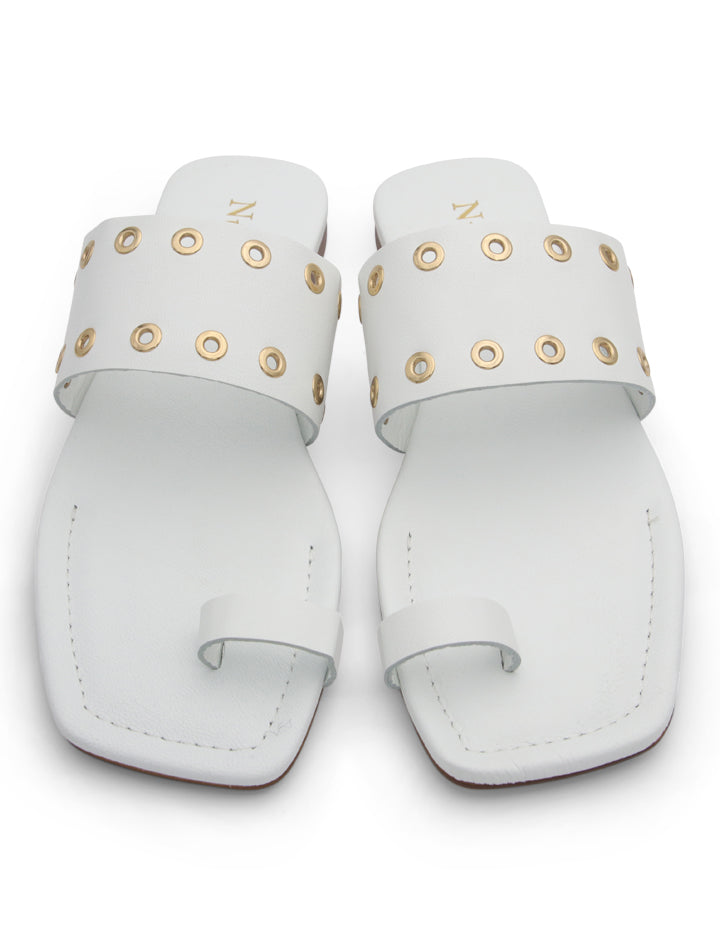 Sandalia Cool de Tachas Blanca tiene un diseño limpio y moderno, con un toque chic gracias a las tachas metálicas. Esta sandalia plana es perfecta para el día a día: cómoda, ligera y con estilo. Llévala con vaqueros, vestidos o pantalones fluidos.