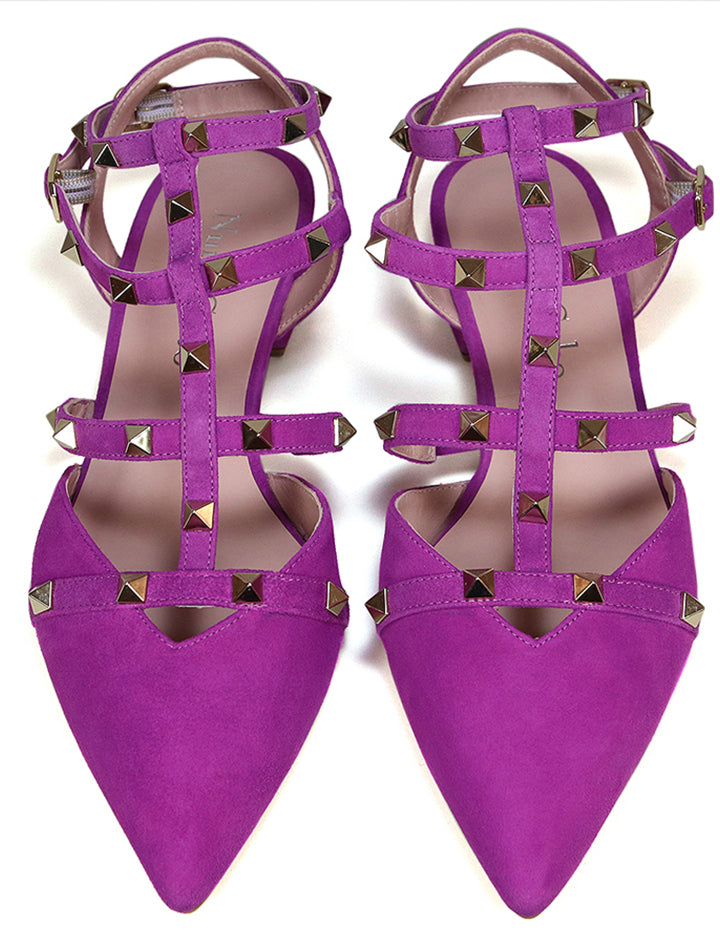 El patrón de esta sandalia es perfecto para abrazar dándole seguridad al caminar y favorecer al máximo.Está fabricada artesanalmente en piel ante con forro piel y lleva adorno de tachas metálicas a lo largo de la pala.