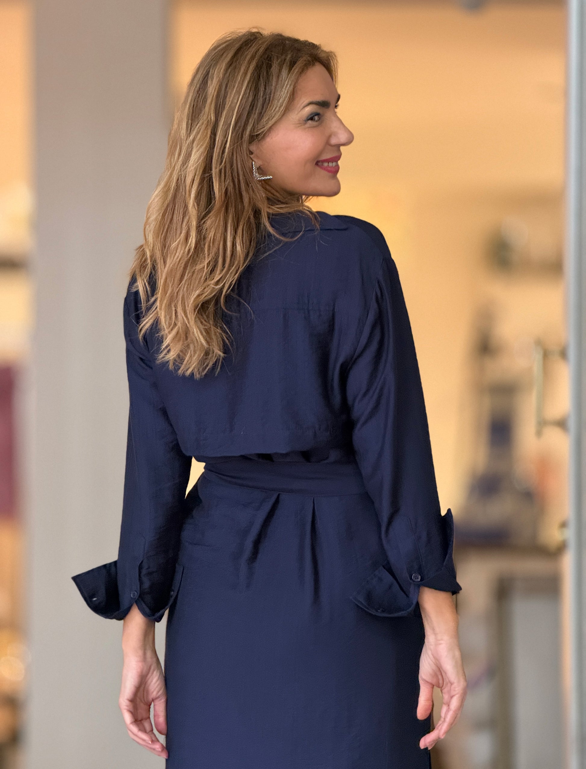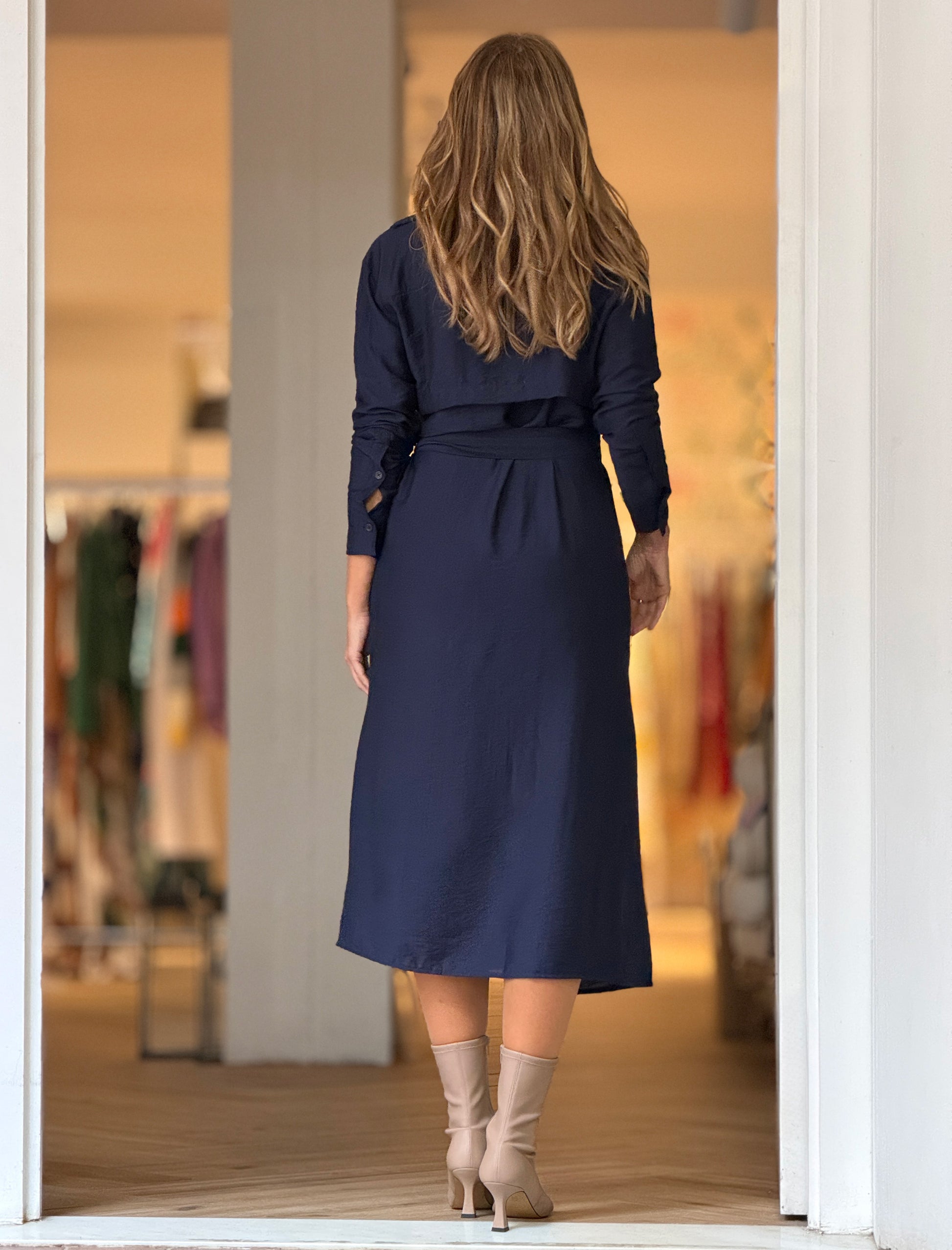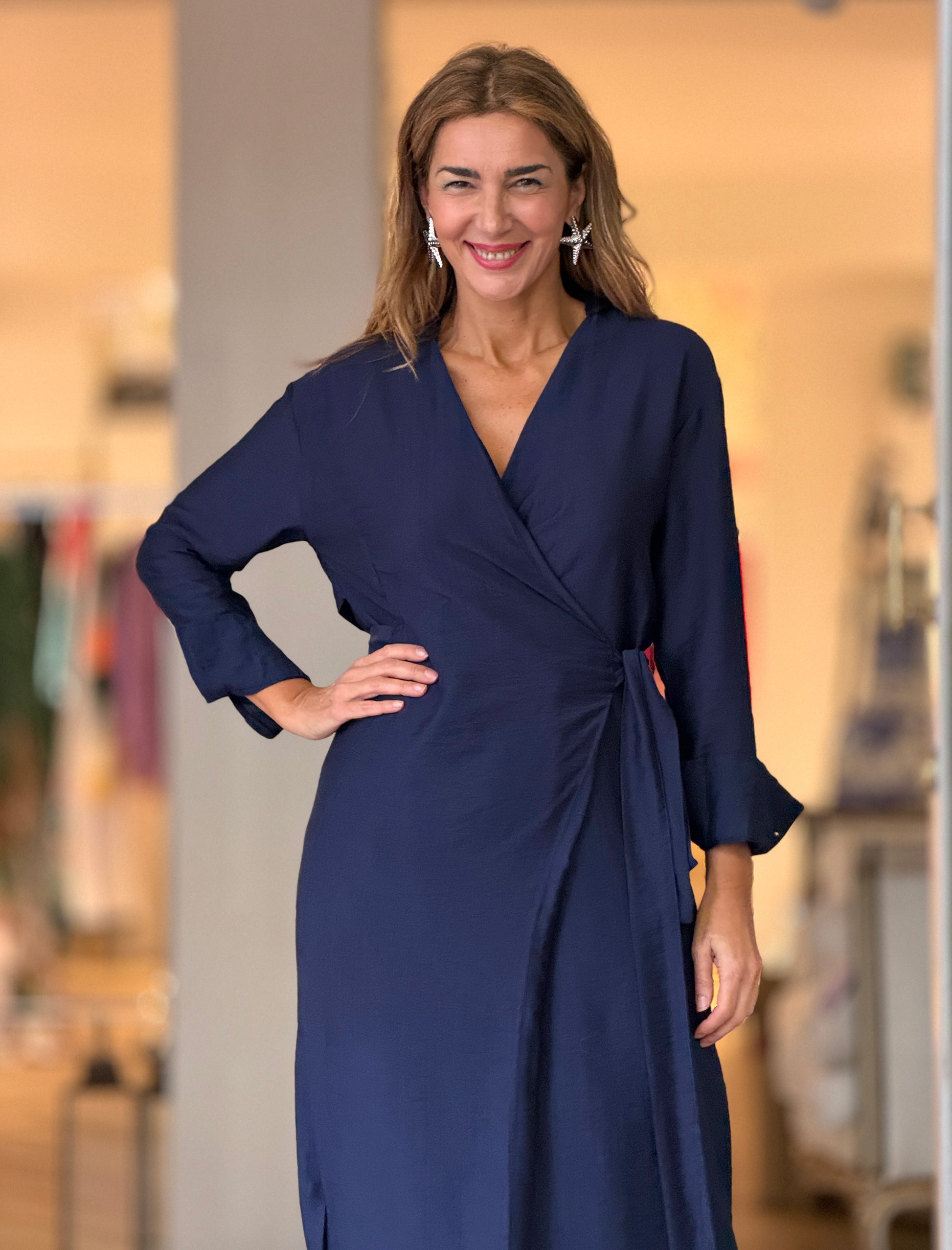 Vestido cruzado azul marino elegante sienta increíble y lo puedes combinar con todo. Su diseño cruzado marca la cintura y estiliza, al igual que su escote en pico y el corte midi, que lo hacen superfavorecedor. Es un vestido elegante que junto con unos zapatos de salón, queda igual para cualquier evento.