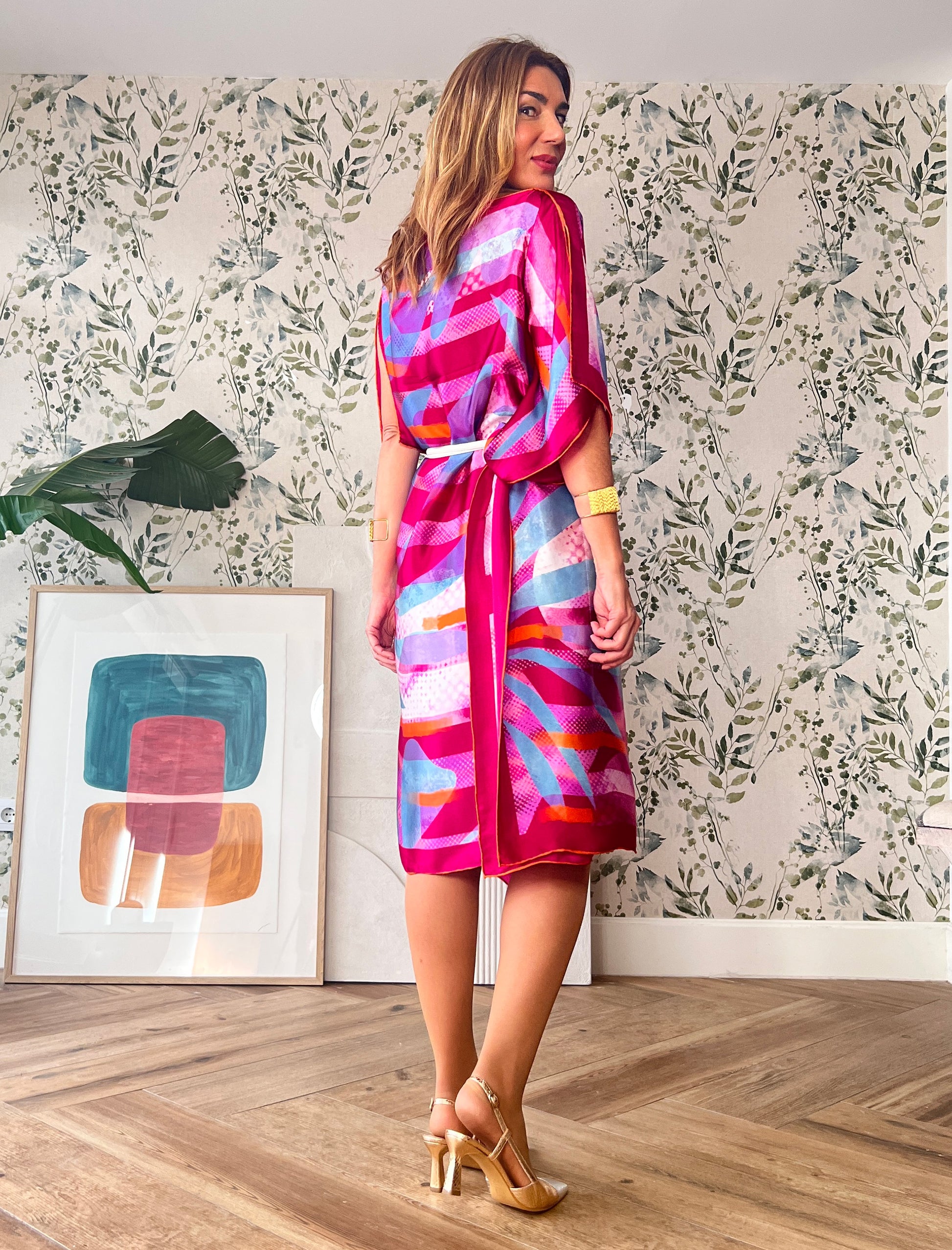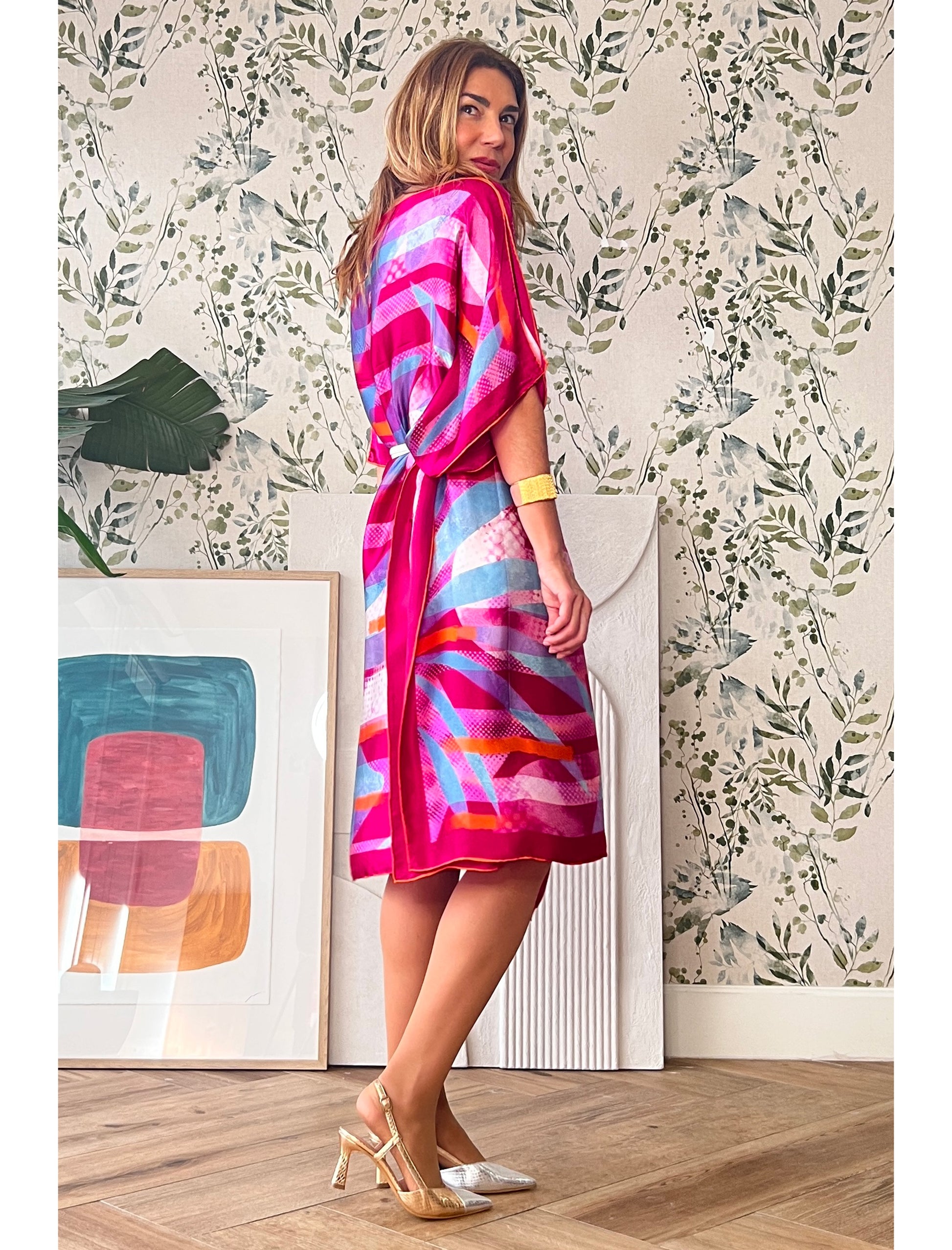 Este vestido de seda está confeccionado a mano uno a uno, Cada costura está cuidadosamente elaborada por manos expertas para un acabado artesanal. Tienes además la ventaja de ponértelo por ambas caras, con lo que tienes dos vestidos en uno. Es el vestido perfecto por lo bien que queda, lo que favorece , su fluidez y el estilo que desprende .Una pieza única para siempre en tu armario