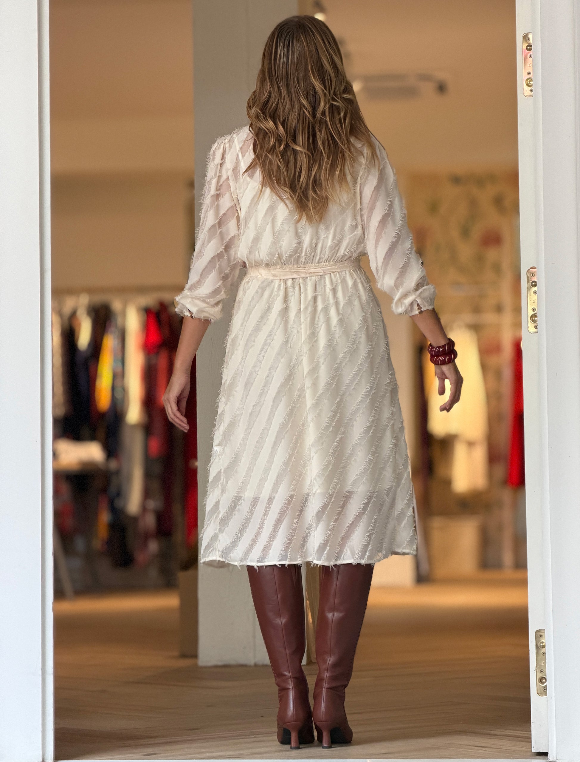 El escote en “V” alarga visualmente el cuello y aporta un toque femenino, y su tono marfil hace que sea un vestido ideal para eventos de día, celebraciones o cenas especiales.