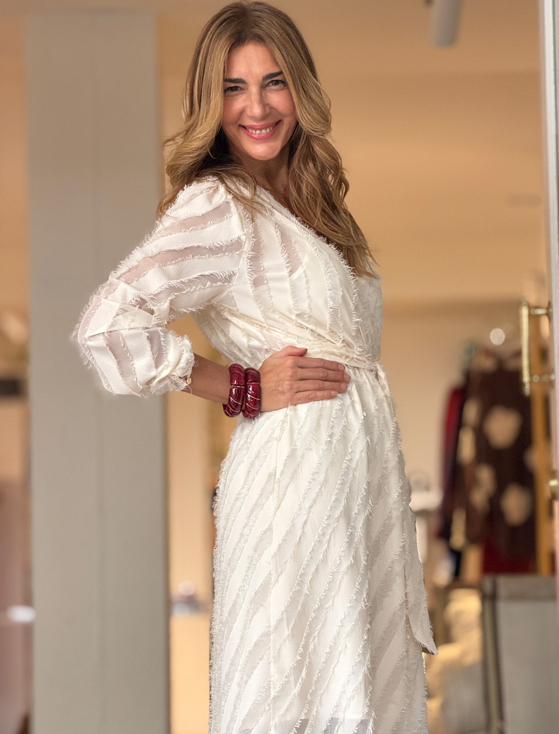 El Vestido Fluido Manuela Marfil es una prenda elegante, luminosa y perfecta para ocasiones especiales o para quienes buscan un look favorecedor. Su tejido ligero con relieve aporta movimiento y un acabado sofisticado, mientras que su corte fluido estiliza la figura.