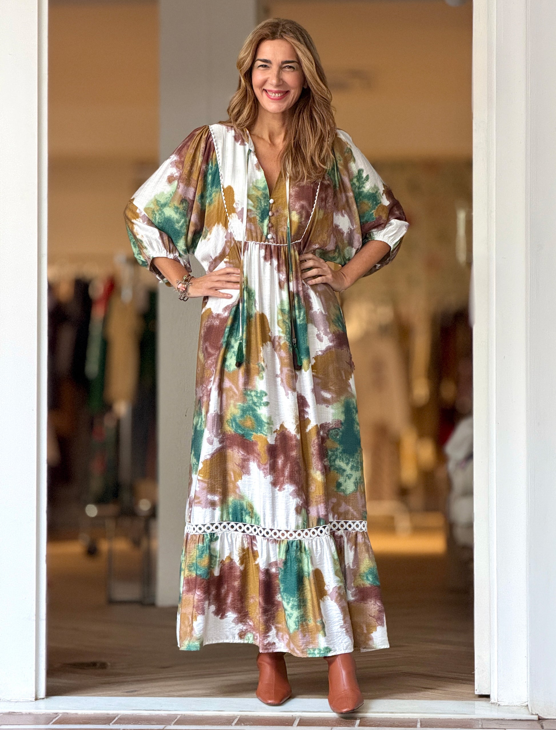 Vestido boho en tono arena muy fluido de viscosa y algodón con corte al pecho y mangas amplias. Tiene falsa botonadura en el frontal, cuello caja y tiras de encaje en volante y pechera.