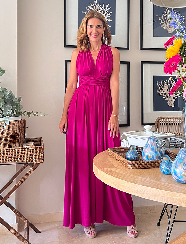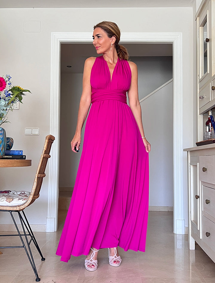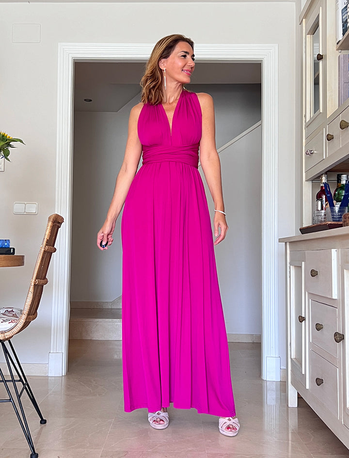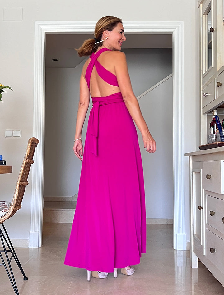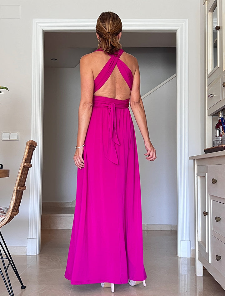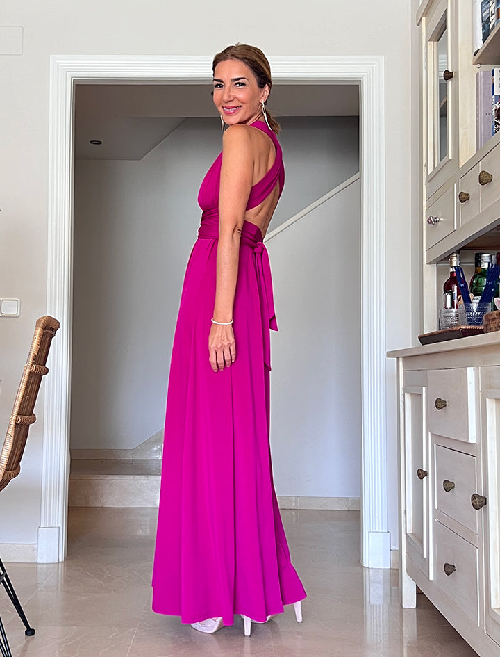 Este versátil y especial vestido, tiene dos tiras anchas que parten de la cintura y se anudan en el torso de muchas formas posibles, teniendo varios vestidos en uno, tiene una caída espectacular y es tremendamente favorecedor